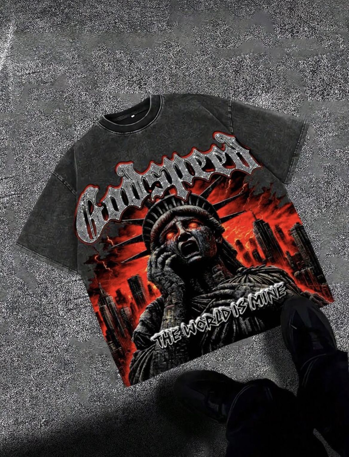 Make a statement with a design that demands attention. This tee features an aggressive, high-detail graphic of a crumbling Statue of Liberty set against a hellish cityscape, perfectly capturing the "THE WORLD IS MINE" ethos. The apocalyptic red-and-black art is contrasted against a vintage-heavy mineral wash, giving it that sought-after "thrifted from the future" look. Product Highlights •SHIPPING SAME DAY A • Aesthetic: Gothic Streetwear / Heavy Metal / Cyberpunk. • Texture: High-quality mineral-wash cotton for a faded, gritty texture and soft feel. • The Details: Bold "Godspeed" typography in a metallic, chrome-inspired font. • Colors: Choose from Washed Black, Concrete Grey, or Coffee Brown. Godspeed The World Is Mine grey T-shirt #goth #emo