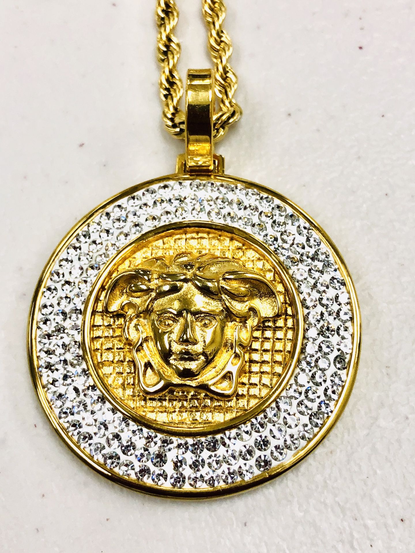 Greek God Medusa Head Rope Chain Necklace Life Time Warranty ✅ Material: 14k Gold Filled over precious metal for a life time warranty!! ✅ Chain Style: Rope twisted Link famous hip hop link Bracelet ✅ Includes: One 24" Gold Chain Necklace and One Pendant. ✅ Chain thickness: 2 mm wide. ✅ Fast Shipping: We ship out the packages on the same day we received the order before 3pm pst. ✅ Condition: Brand New and High Polished comes in a gift box. 100% 14k Gold Filled, so it will not tarnish or change Color. Please note that the color may be slightly different than photos, due to the difference in the monitor lighting