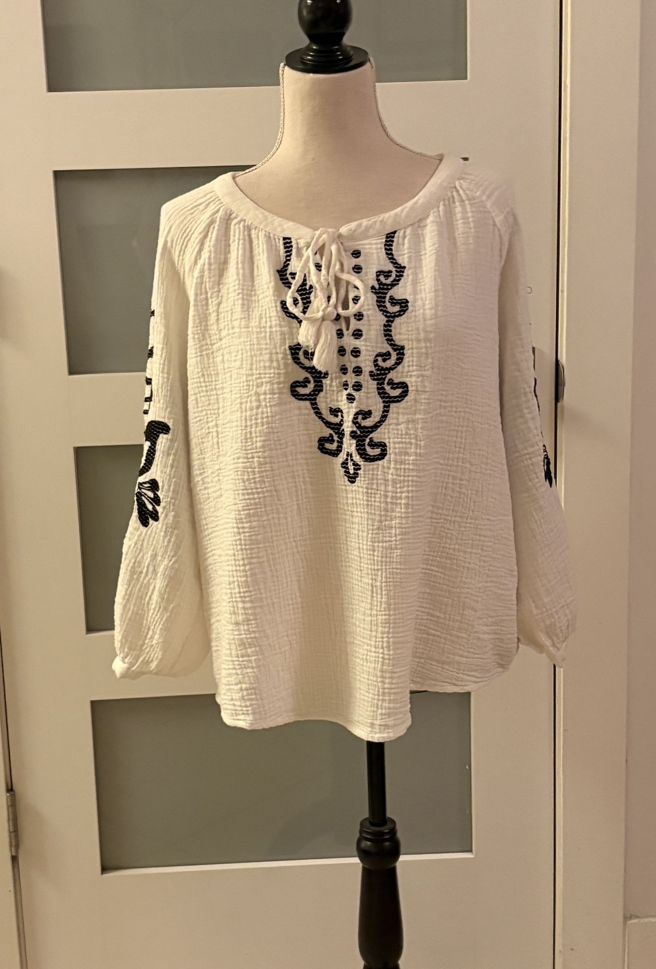 This bohemian-style blouse is a Style & Co. design, exclusively for Macy's. It's white and blue, 100% cotton, and comes in size 1XL.