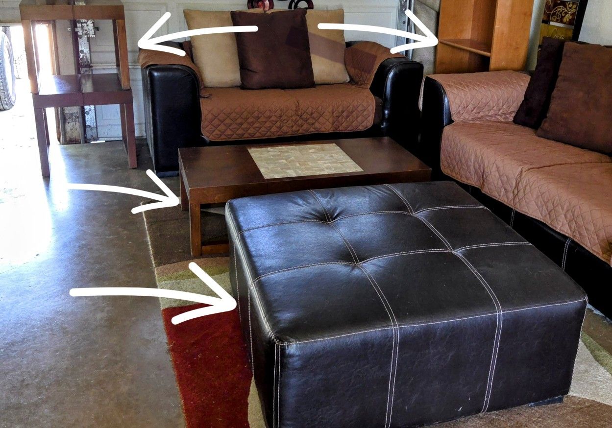 Sofa and loveseat $300 Good Condition All other items for sale Ottoman, Coffee Table, 2 end tables, area rug, book shelve MPU Valley Hi area. Thank you