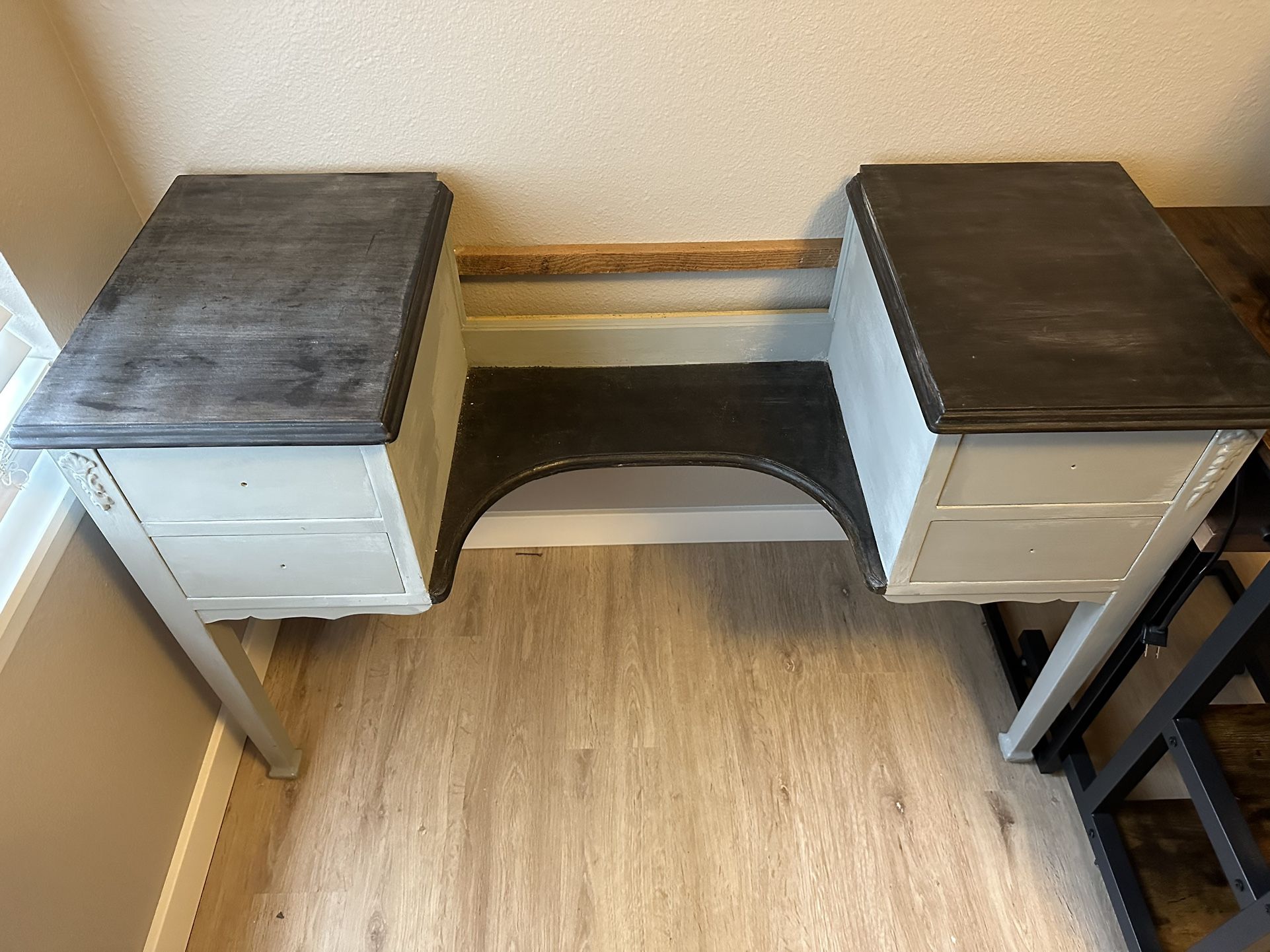 This is an antique vanity that needed a lot of work. I painted it with grey chalk paint and stained the top with a dark walnut stain. The big mirror easily attaches to the top of the base, as well as the two side folding mirrors, which were removed for transport so they wouldn’t get broken. Open to reasonable offers. 46" wide 17 3/4" deep Table top is 30" high Mirror stands about another 35" high Fully assembled it would be about 65" high