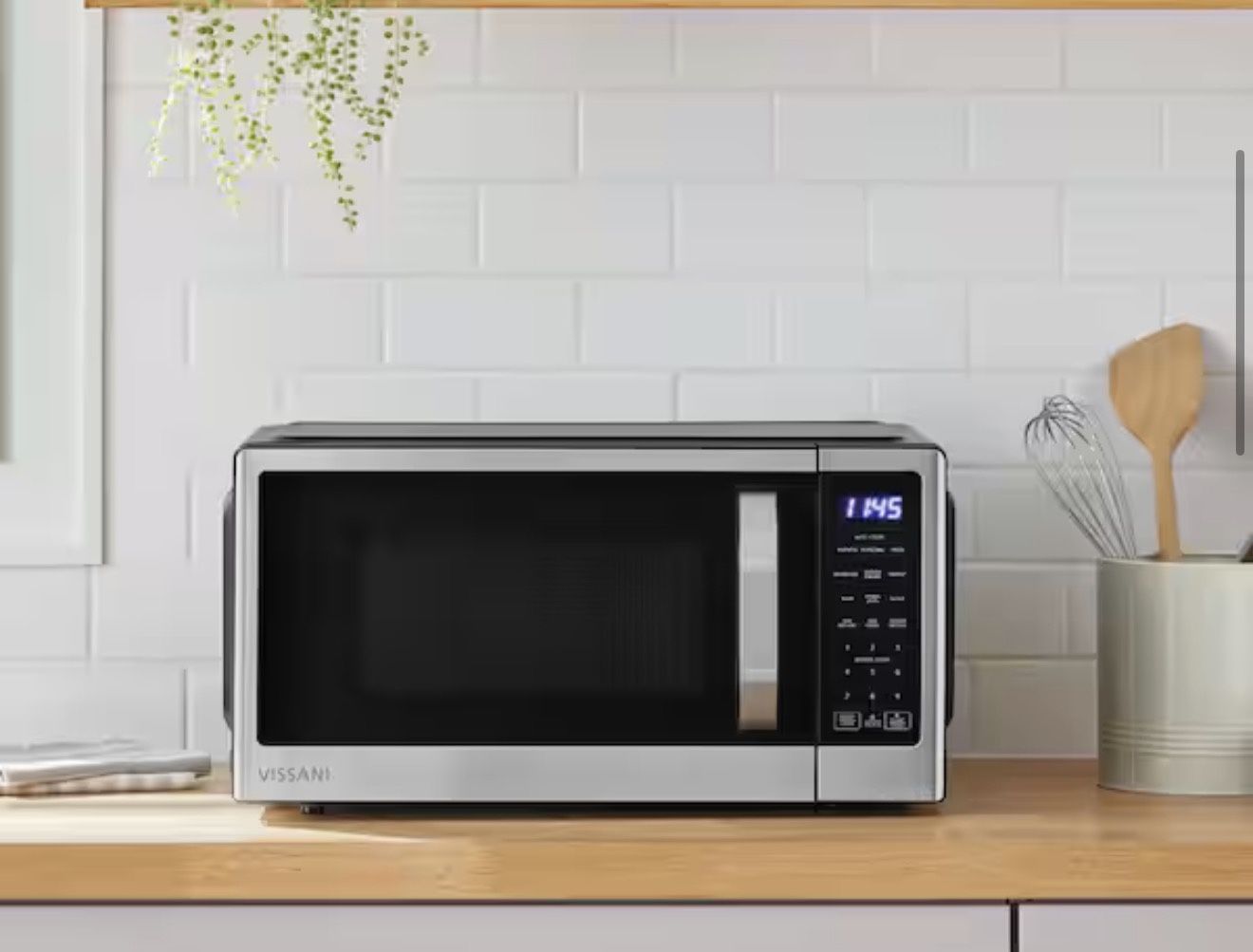 Brand new in its own open box not used Vissani 21 in. 1.1 cu. ft. 1000-Watt Countertop Microwave Oven in Fingerprint Resistant Stainless Steel and Bar handle 1.1 cu. ft. capacity provides space for all your cooking needs 1000-watt of cooking power 6-one touch cooking and reheating program menus including popcorn, pizza, potato, frozen dinner, beverage and reheat 1-to-6-minute express cook 1-touch cooking options 10-power levels for maximum cooking flexibility 12-3/8 in. removable glass turntable Programable digital timer and clock with white LED display Weight defrost program Easy to use control panel with white LEDs and 1-touch cooking for everyday ease of use Child-safe lock-out feature Stylish design with ergonomic handle for comfortable daily use that matches a wide array of kitchen designs