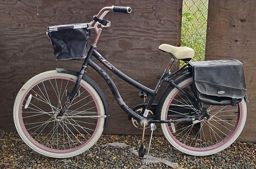 Has front basket and back storage pouches. works fine tires are good the bike is just burnt by the sun from where I had it in the back needs to be cleaned has lots of dirt from being outside (feel free to make offer)