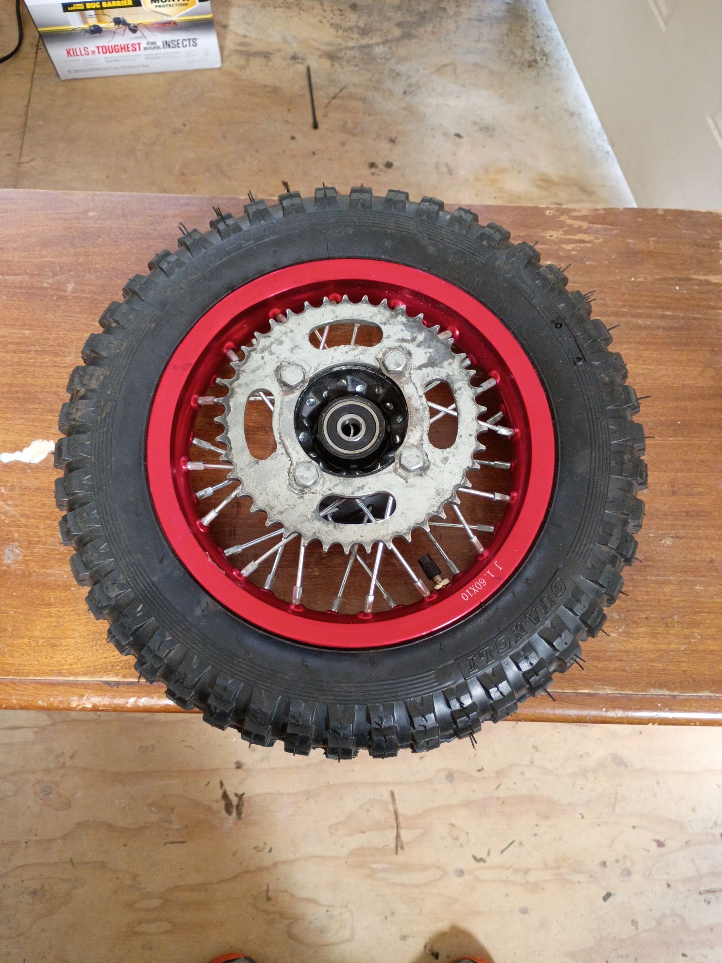 Brand new rear wheel tire for pit bikes or dirt bikes, has never been used, comes with rear sprocket, retail price 75.99