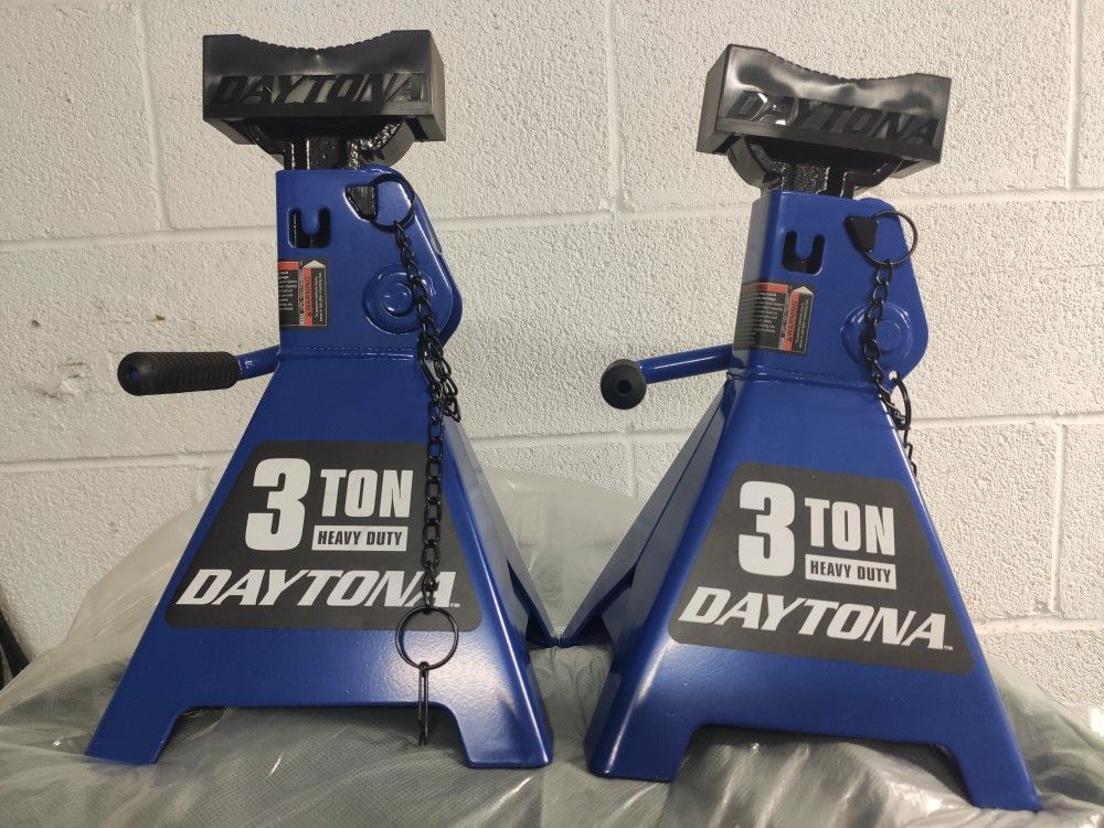 Daytona 3-ton, blue, heavy duty, ratcheting Jack Stand. Like-New... used only twice in two years. Retail price is $45 plus $10 for rubber pads.