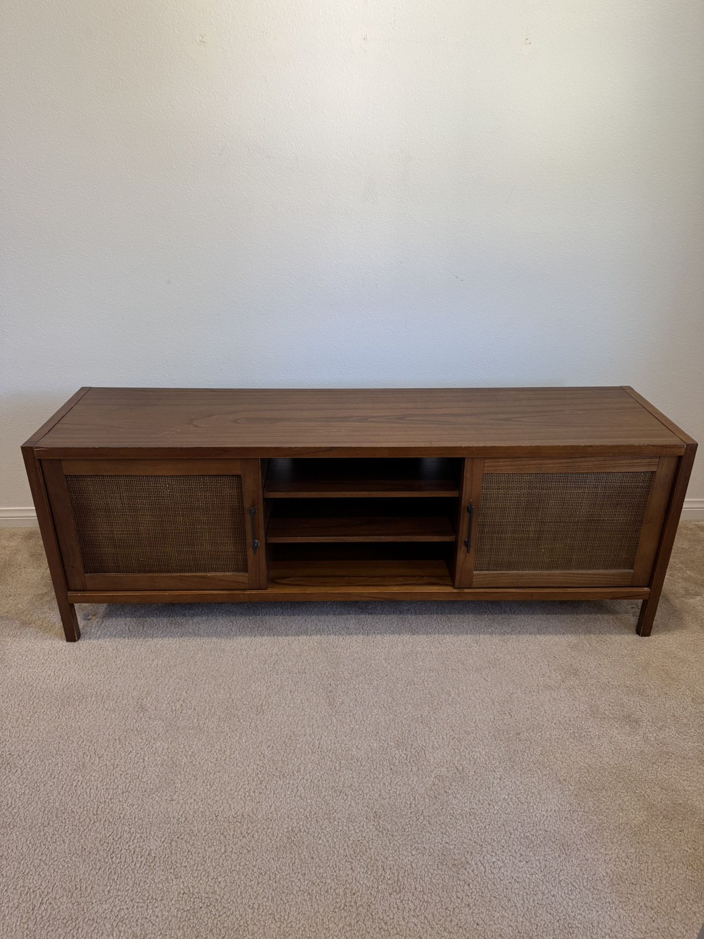 Solid wood Rattan Tv stand from Target (used) Included screenshot from Targets website showing original price 2 adjustable center shelves, 1 adjustable shelf in each side door, cord management slots in back from all shelves/doors and adjustable leveling feet. Fits up to 69” tv 59.5”W x 15.5”D x 22”H