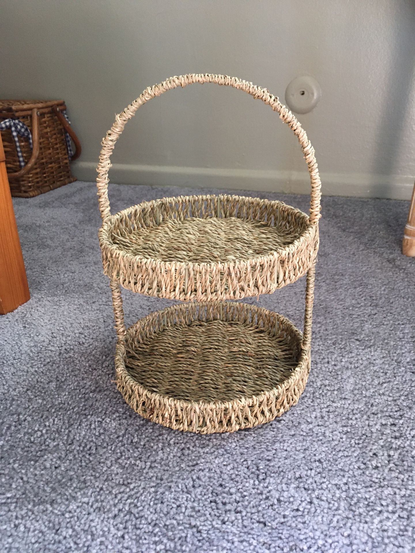 Gray-brown woven rattan two-tier tray in good condition. Great for home decor, kitchen or bathroom storage, or tea parties! Be sure to check out my other items!