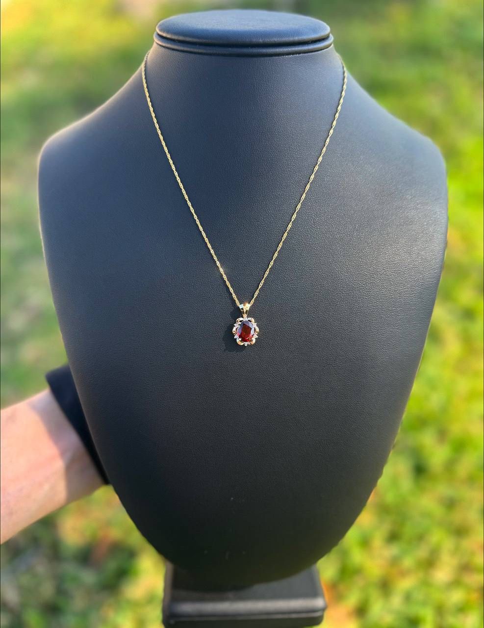 Gorgeous 14k solid gold necklace chain and pendant with natural oval shape 2 carat Ruby stone in the middle and 6 Diamonds around, approximately 0.18ctw. Size of the chain: length 16.75 inches, width 1.20 mm. Chain made in Italy. Total weight: 2.9 grams . The best choice for you! Perfect gift💍🎁 ❤️ We buy Rolex and Audemars, patek . Do layaway in vipawn Boca Raton 🔥💎💸