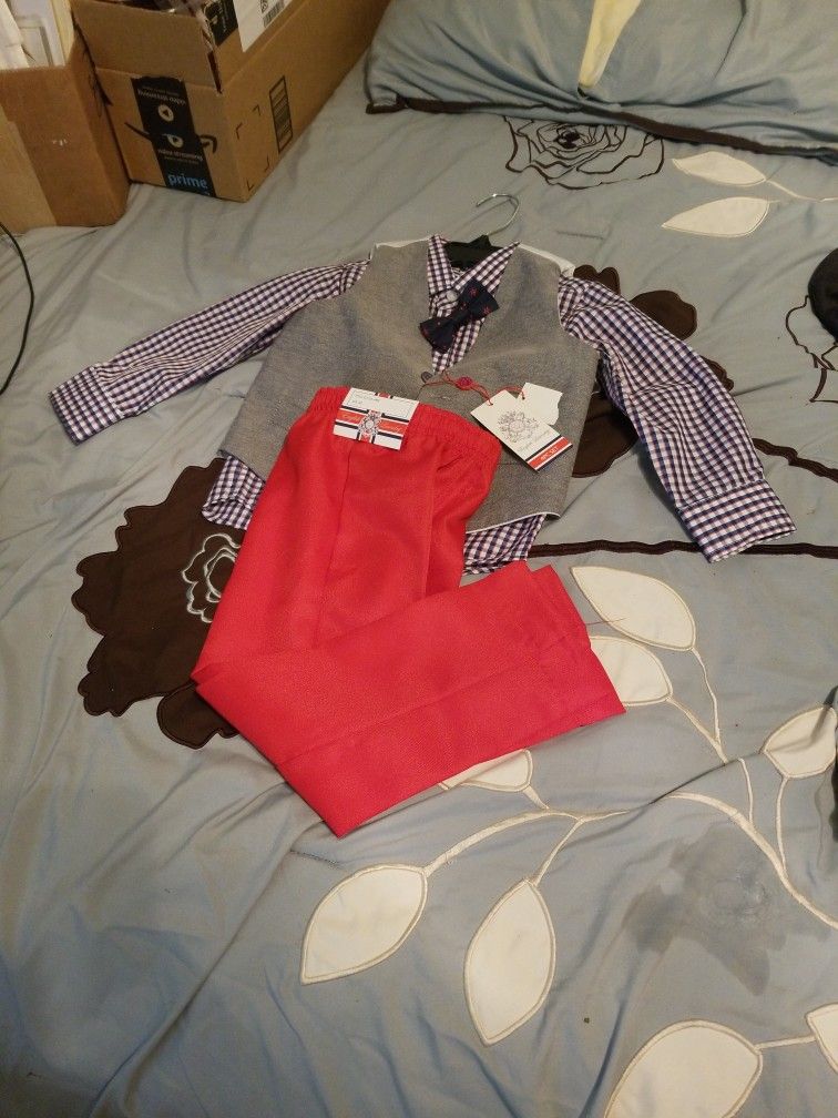 Brand new , with tags 3t outfit. There is one small stain on the shoulder, see pictures. We have more clothes to bundle together and save more.