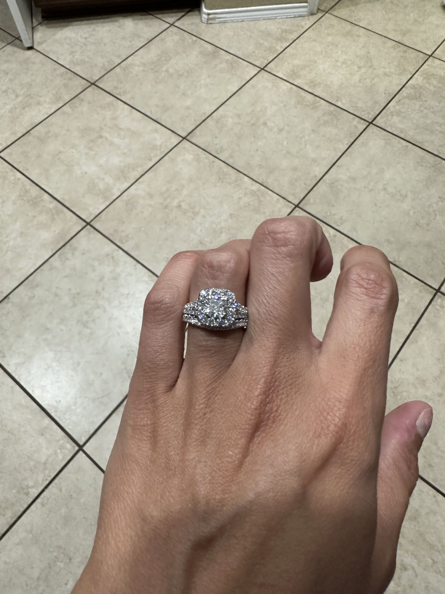 Beautiful engagement ring with wedding band, 14 Karat white gold , primary stone 1.0000 Carat cushion cut Diamond color: white color Supporting diamonds .0350 carat