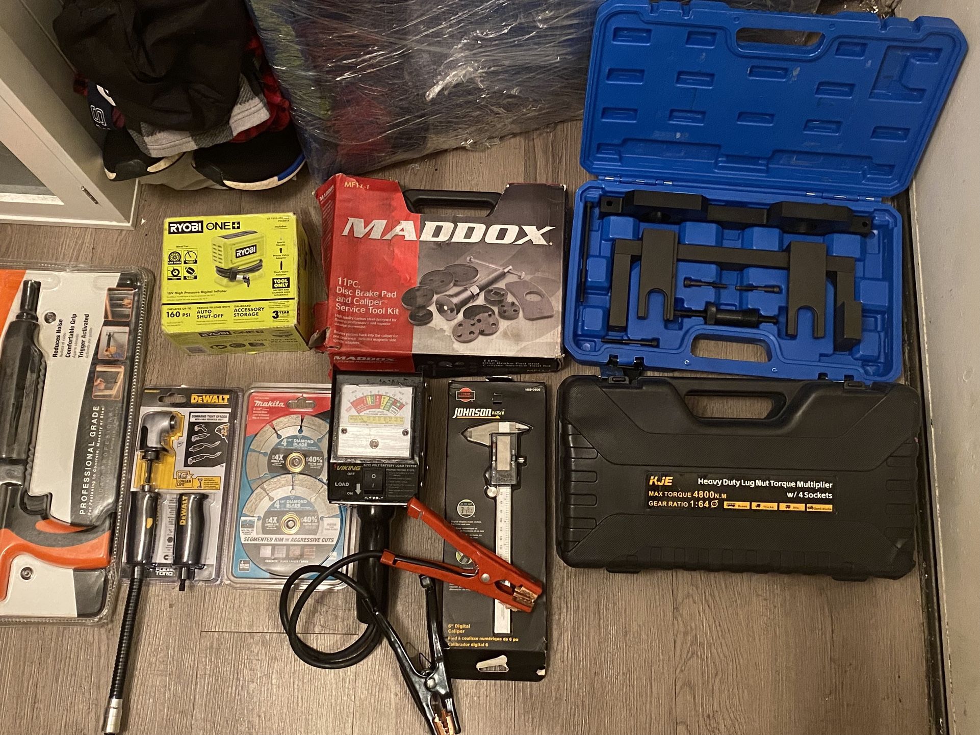 Mixed mechanic/automotive tool lot — all in good condition. Great starter set for DIY car work, truck/RV service, or shop use. Selling as one bundle only. Includes: • Heavy-duty lug nut torque multiplier set (4800 Nm, 1:64) w/ sockets & case • Disc brake pad & caliper service tool kit (Maddox) • Battery load tester (6/12V) • Ryobi ONE+ inflator (tool-only) • Johnson digital caliper • Makita diamond cutting wheels (new) • DeWalt right-angle attachment • Bearing/bushing service kit (blue case) • Professional hacksaw Everything shown in photos included. Great value if you work on cars, trailers, trucks, or RVs. Pickup only.