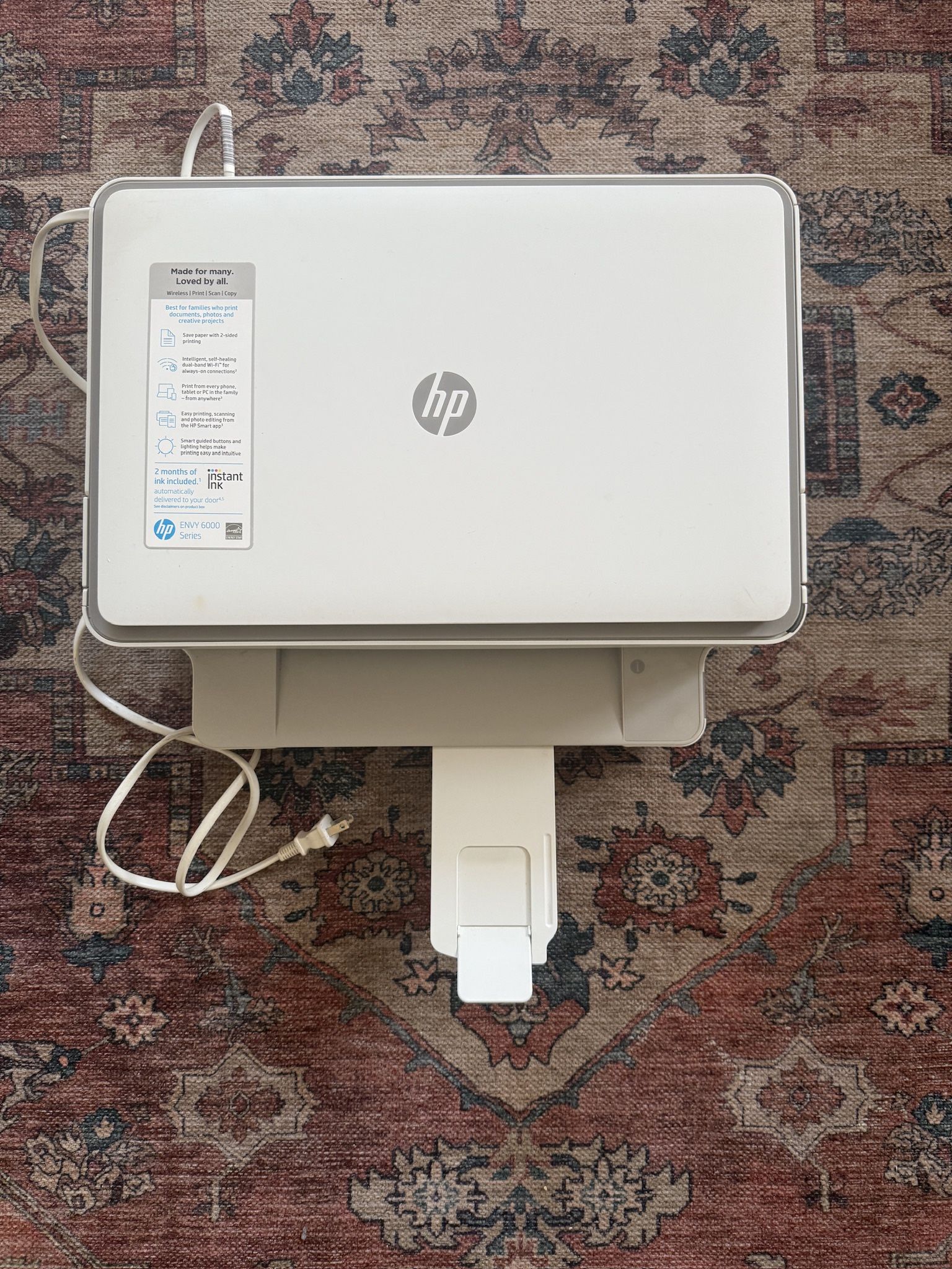 Clean, works great, Prints, copies, and scans. Connects to Wi-Fi and allows printing from smartphones and tablets. Can connect to cloud storage services like Dropbox and Google Drive for easy printing and scanning. Made with more than 20% recycled plastic by weight.