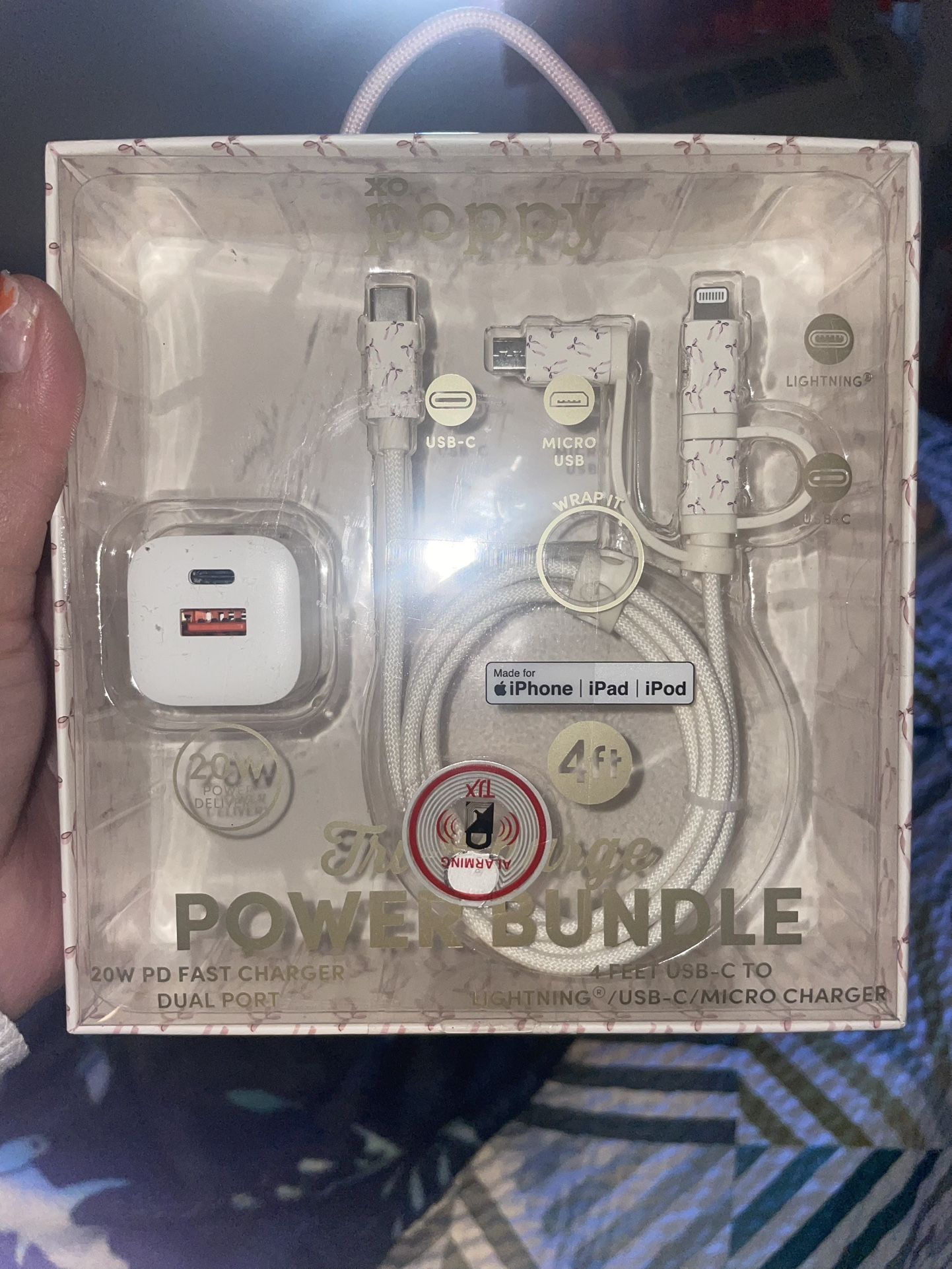 Brand New Poppy Charging Bundle For iPhone / Galaxy Phones. For Sale. 20 w PD fast charging port. 4 feet USB - C to lightening / USB -C / Micro charger.
