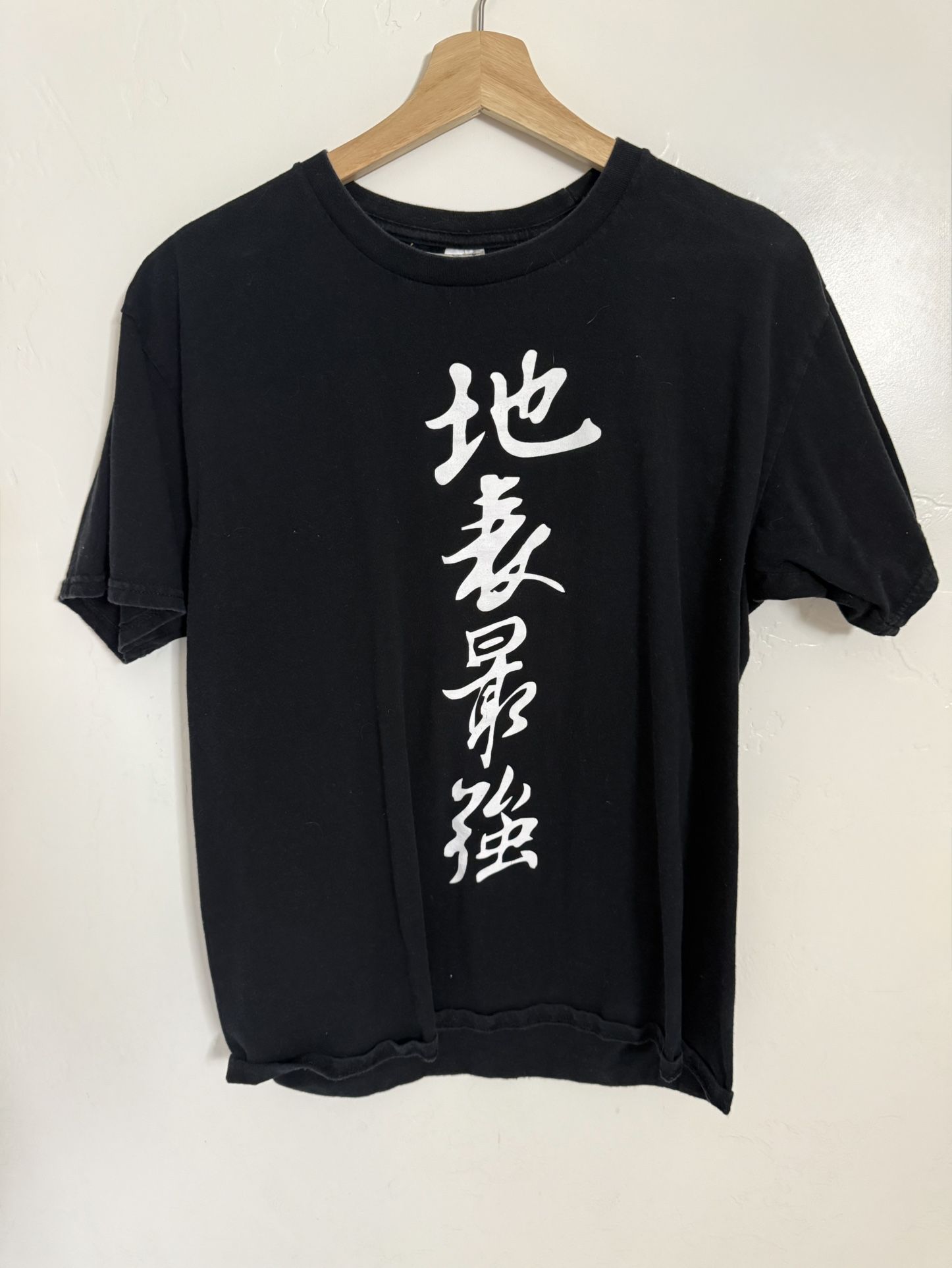 Selling this J Team black graphic T-shirt featuring the bold Chinese characters “地表最強” (meaning “The Strongest on Earth”) on the front and the official J Team logo on the back. Made of 100% cotton (Gildan blank), comfortable and easy to wear. Condition: Brand new , no stains or major damage. Minor signs of normal wear but still in great shape.