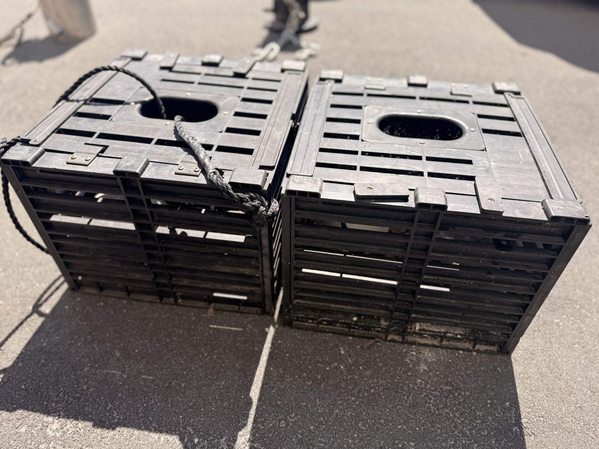 Commercial Style Blue Crab Traps – 2 Traps w/ Concrete Weight Set of 2 heavy-duty crab traps. • Solid plastic construction • Concrete weights in bottom • Rope included • Ready to drop and use Used but in good condition. Doors and hinges working properly. Great for blue crab in the bay or river. $110 for both or $60 each