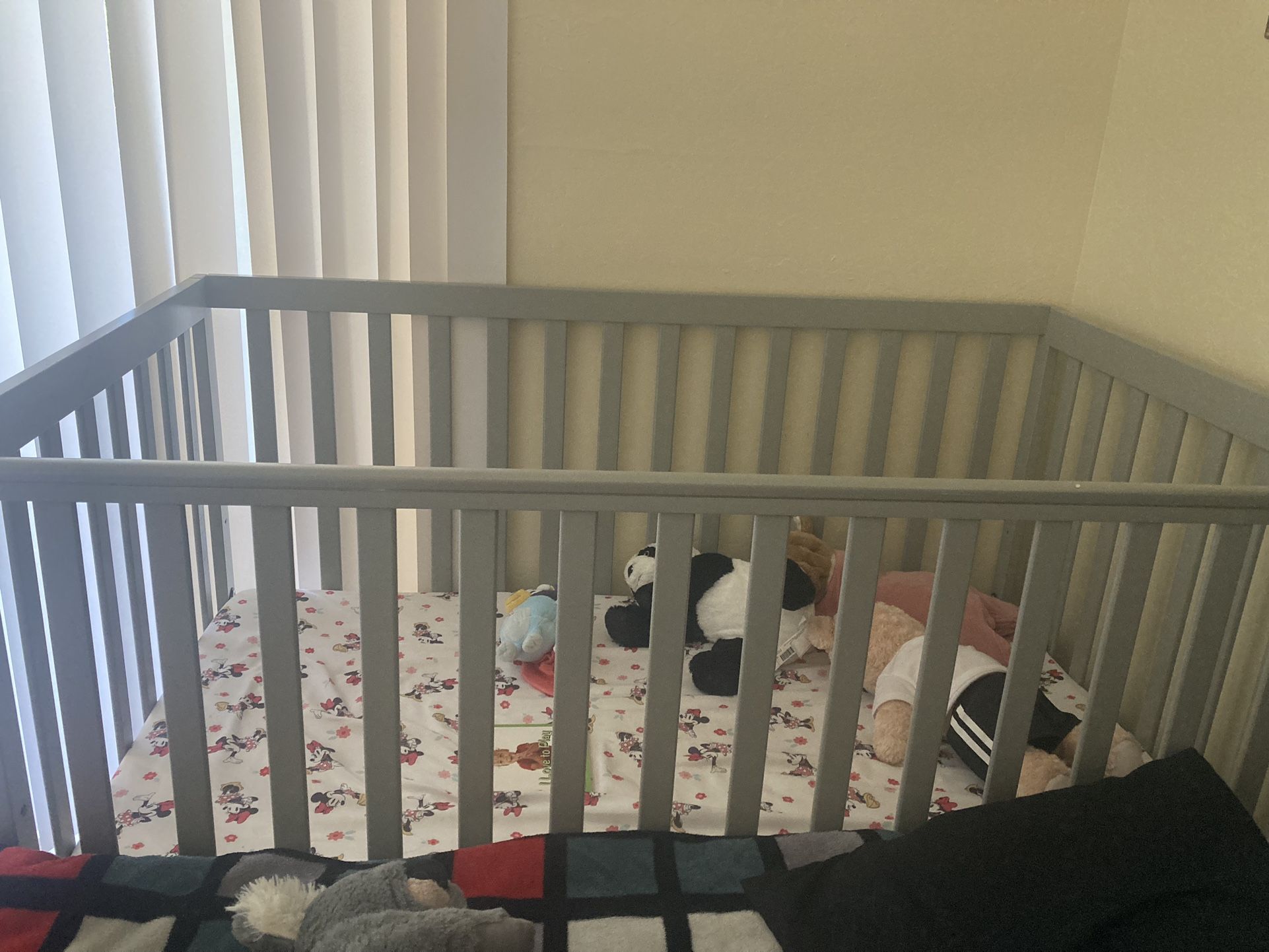 It’s in really good condition!! No scratches!! Includes the mattress!! And sheet and the protector that goes around the crib