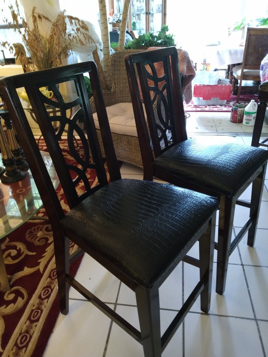 2 dark brown wooden bar stools with black seating. They are 43 inches tall.. $20 each.