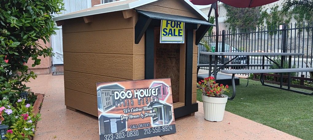 LARGE SELECTION OF DOG HOUSES. All OUR DOG HOUSES ARE BUILT TO LAST. AND TO HOLD HEAVY DOGS. ALL WATER PROOF. ALL WOOD FRAMED BASE TO TOP. THEY WILL LOOK NICE AND CLEAN FOR YEARS TO. COME. $ 649. THE STARTING. PRICE FOR A LARGE DOG HOUSE. WE HAVE MANY MORE DEFERMENT DESIGNS TO CHOOSE FROM. COME DOWN TO OUR LOCATION. OR WE CAN HELP OVER THE PHONE. WE OFFER DELIVERY. FROM DOG HOUSES RIVERS WE. PAINT ALL COLORS...... .