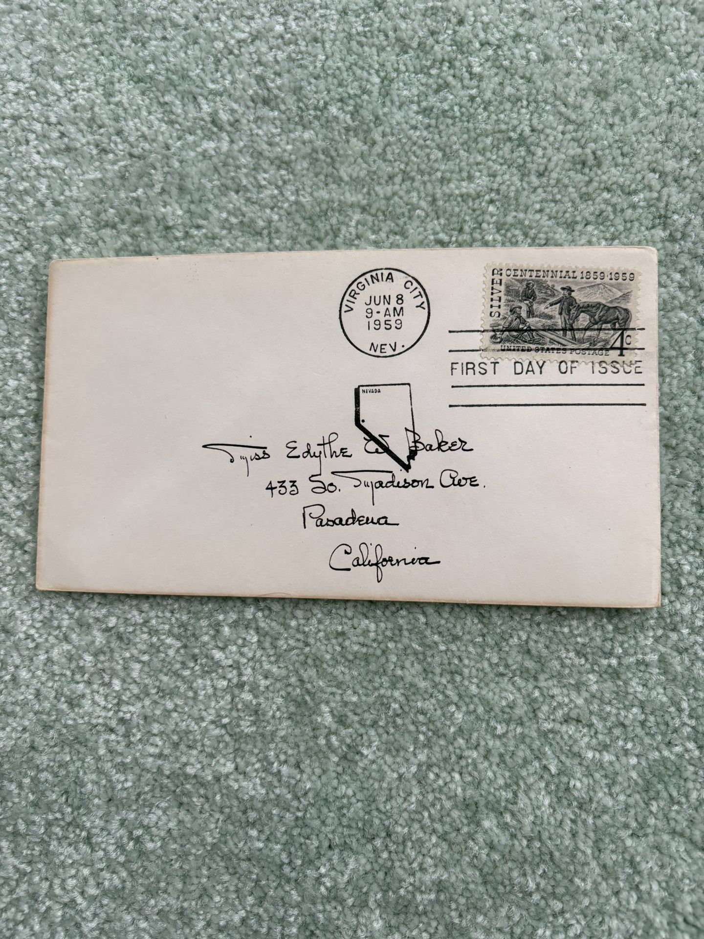This is a 1959 First Day Cover commemorating the Silver Centennial of Nevada City. It was postmarked in Virginia City Nevada on June 8, 1959. It features a 4-cent denomination, originates from the United States, is of used quality, and is in black color. The cancellation type is First Day of Issue, and it is uncertified. This collectible item marks a significant anniversary of Nevada City, making it a valuable addition to any stamp or cover collection.