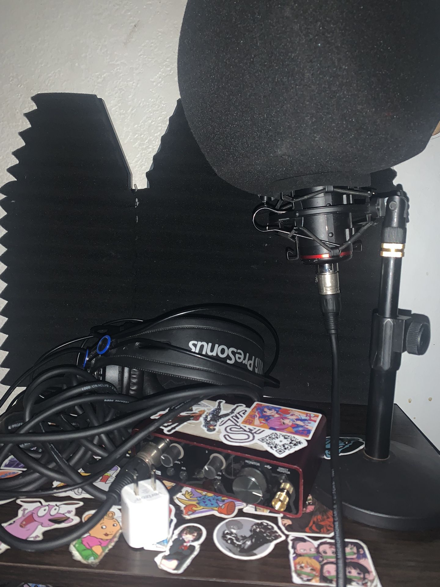 Mic sound shield pop filter interface headphones mic stand another sound shield and cords for the equipment are provided it all works fine except the headphones you have to tweak it