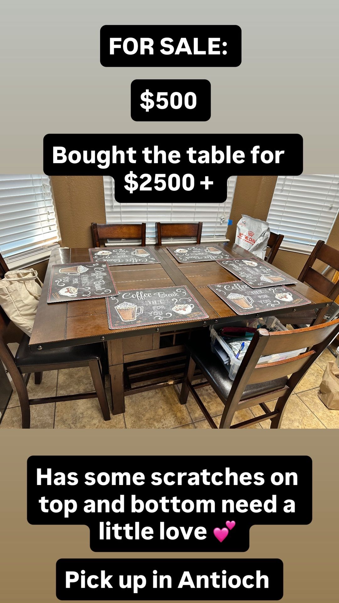 Wood 6 chair kitchen table brown leather has slots to hold wine underneath Has some wear and tear and needs a little love Bought fir $2500 selling for $600 Pick up in Antioch