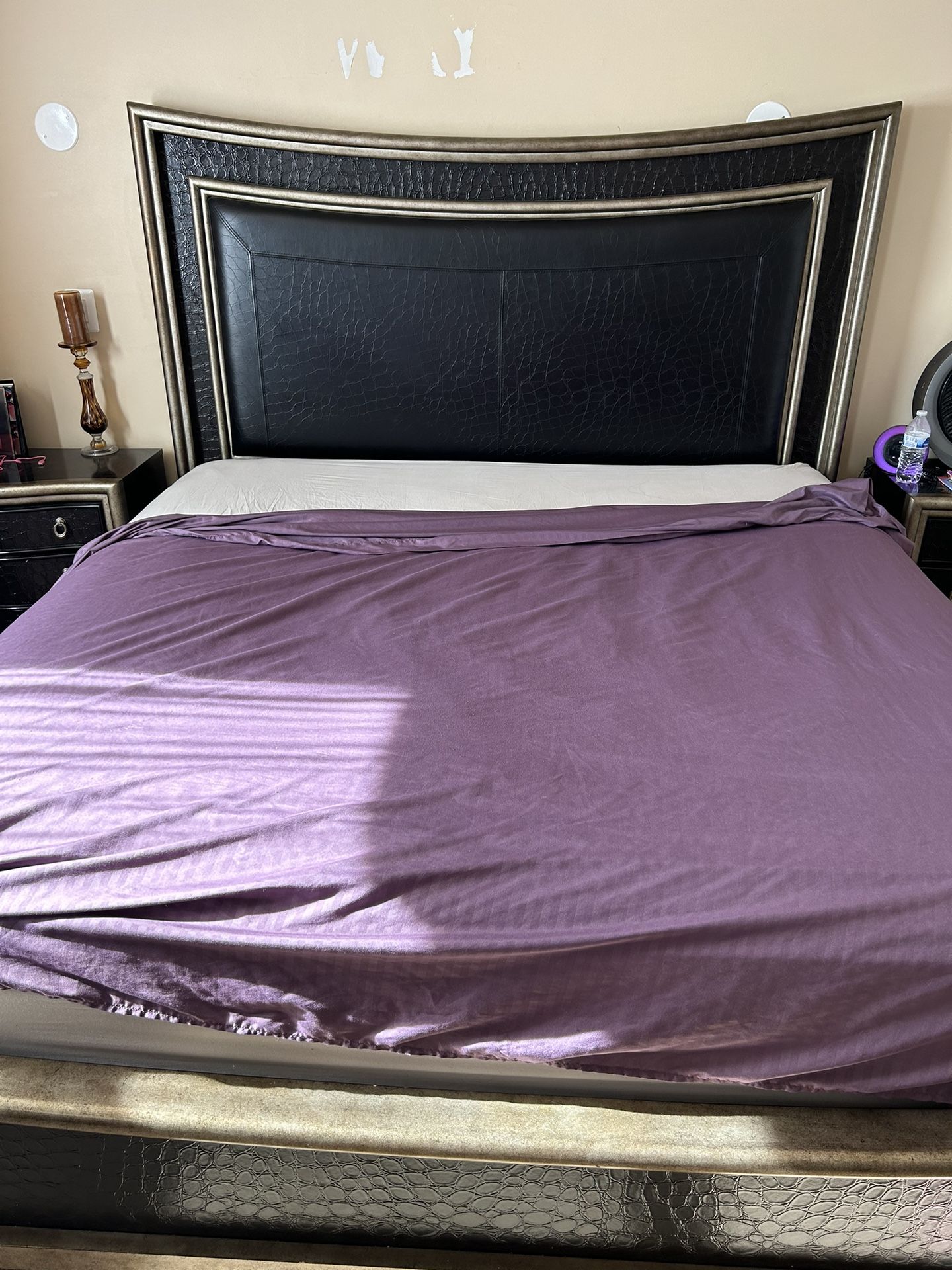 King size bedroom set! Great condition! Heavy, sturdy! Headboard and dresser mirror both light up. Set includes king bed, full frame, 2 nightstands, dresser with mirror, mattress included