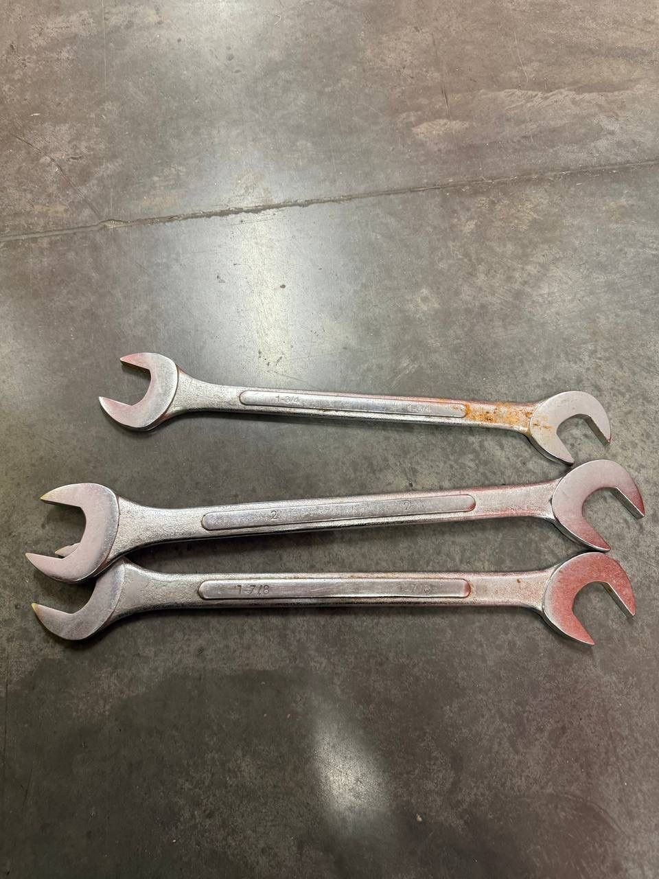 Lot of 3 Large SAE Open-End Wrenches Heavy-duty industrial size wrenches commonly used for machinery, heavy equipment, and truck maintenance. Sizes Included: • 1-3/4" • 1-7/8" • 2" Features: • Large industrial size • Durable forged steel construction • Open-end design • Great for heavy equipment, farming machinery, automotive and shop use Condition: Pre-owned with normal signs of use including minor surface rust and wear. Fully functional and solid tools. Please see photos for exact condition and sizes.