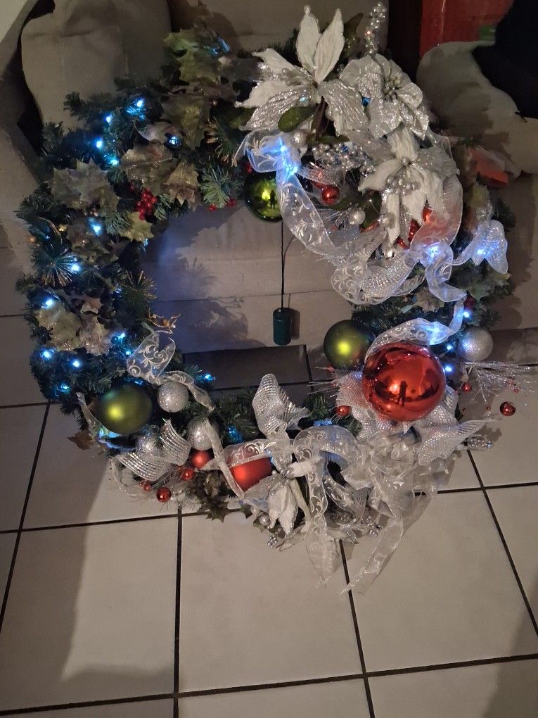 I have a large christmas wreath decorated already with lights just needs some touch ups becuase I had it in storage. Otherwise in great condition.