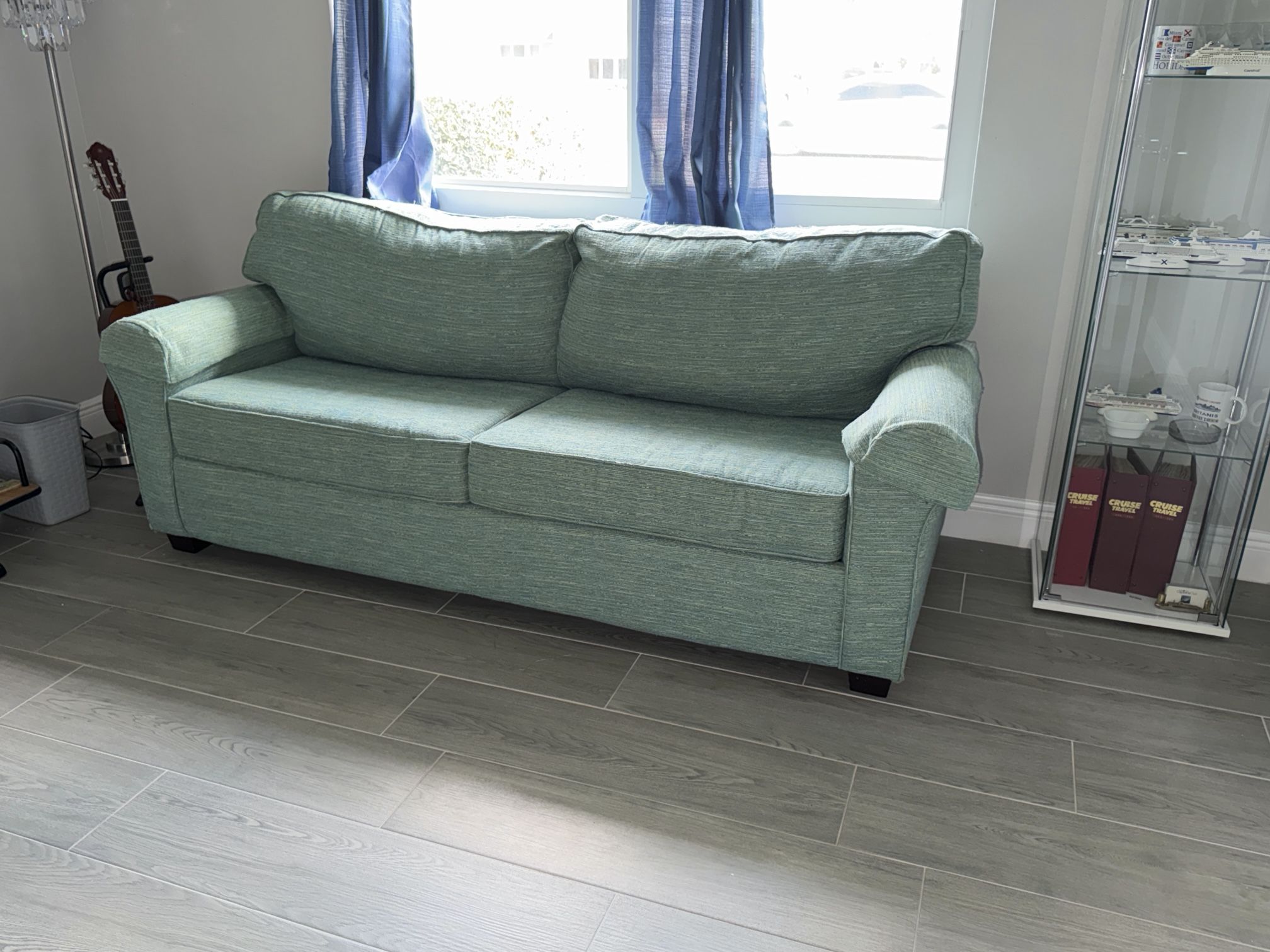 Comfy mint green sofa bed with air mattress.
