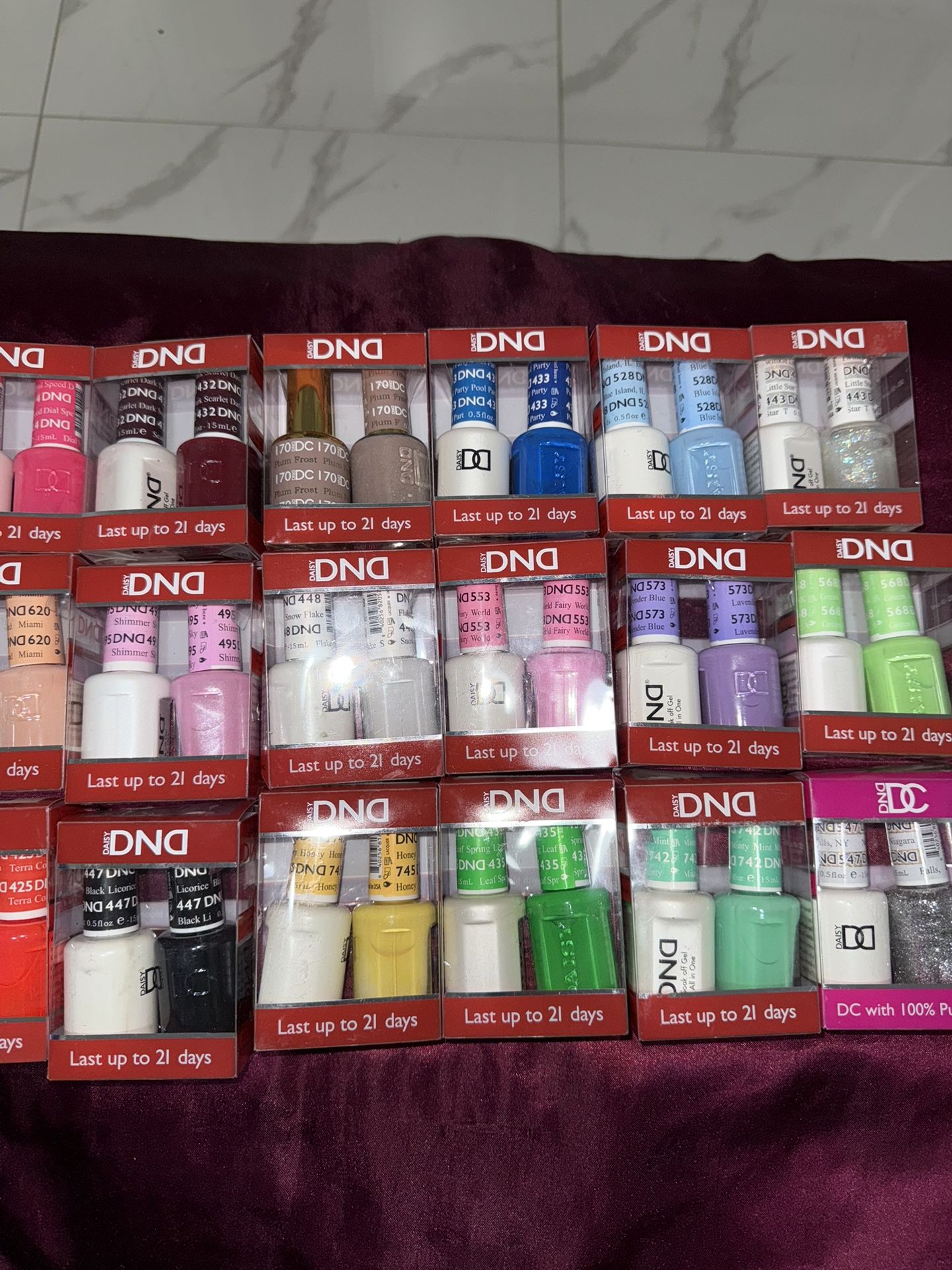 Colección de 24 sets de esmaltes DND Cada cajita incluye 2 esmaltes del mismo color: • 1 esmalte regular (secado normal) • 1 esmalte semipermanente (secado con lámpara UV/LED) Duración hasta 21 días, calidad profesional. Colores variados: nudes, rojos, rosas, glitter y tonos vibrantes perfectos para el verano. Ideal para manicuristas o uso personal. Se vende la colección completa.