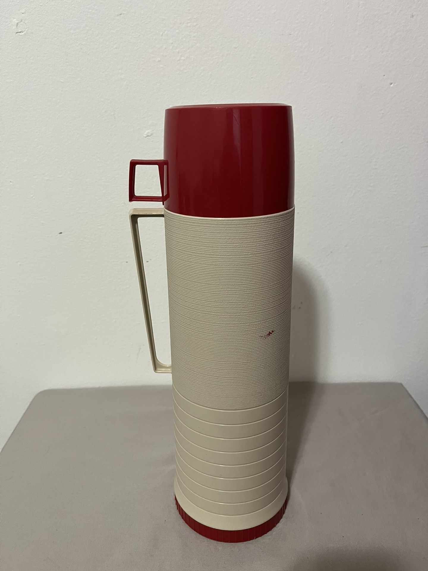 The Vintage Retro Design Thermos Quart Size Model 2402 in red and tan is a classic piece of collectible design. Made of durable plastic, this thermos features a retro design that adds a touch of nostalgia to any space. With the well-known brand of Thermos, you can trust in the quality and functionality of this classic model