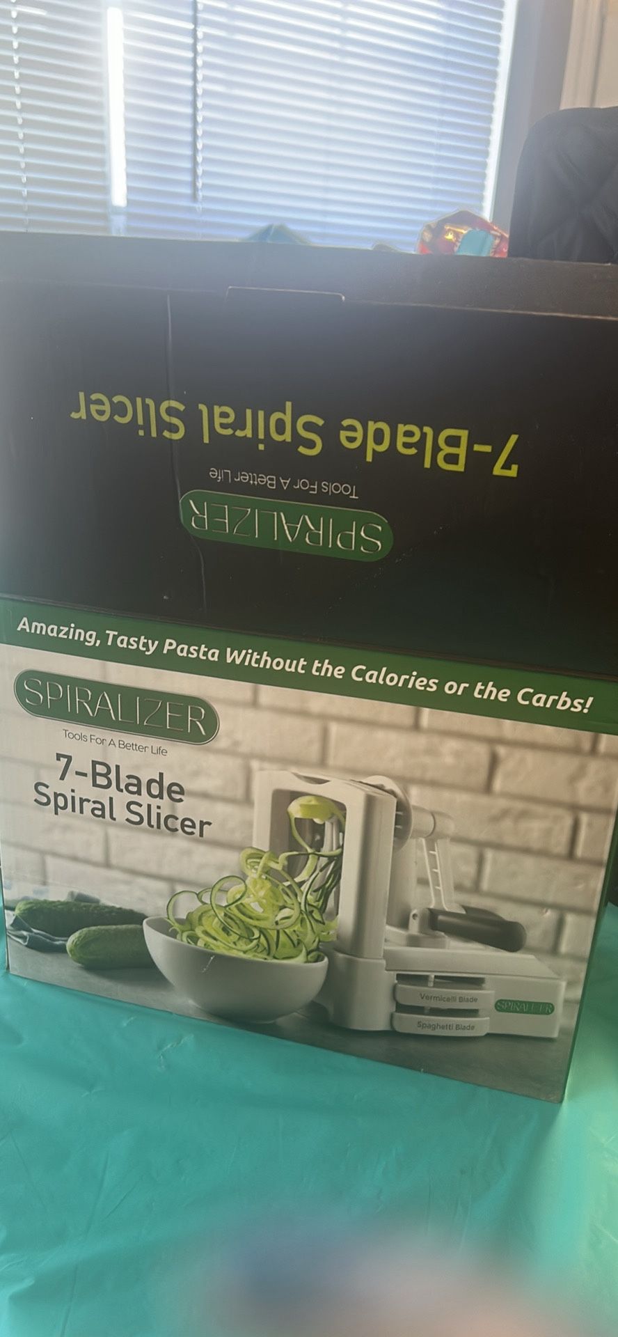 Here you have a brand new seven blade slicer a slice of your vegetables yeah onions just about anything just to make things easier for you. Never use with box open