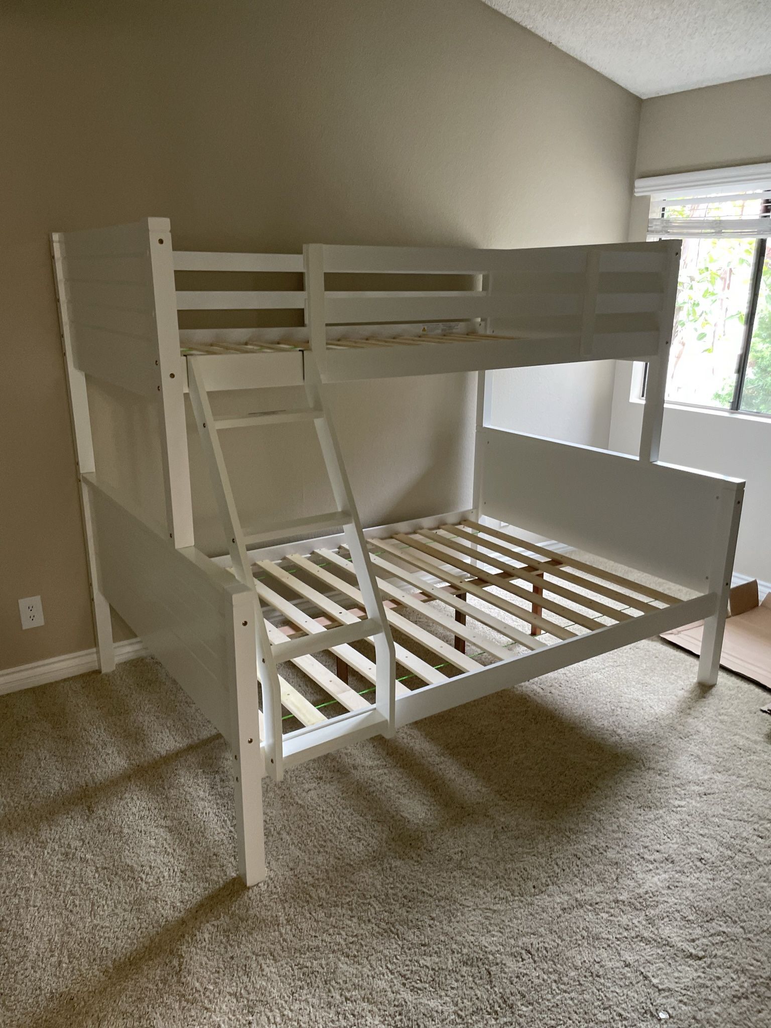 Twin/full bunk bed. Available in espresso & white. Assembly required. Assembly not included. Tax included. Free local delivery. $350 bunk bed only. $550 with mattresses.