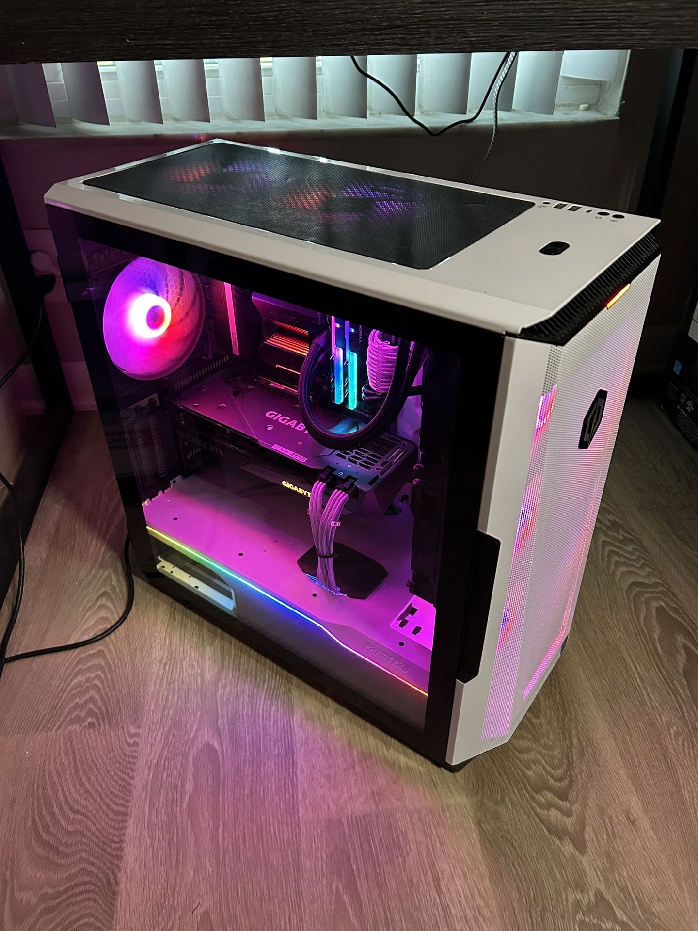 Pc specs are : Gigabyte RTX 3070 8GB Intel i7-11700f CPU (4.9GHz 8 Core 16 Threads) 1TB nvme ssd 2TB hdd Case is Phanteks p500a 16gb of 3600hmz G.Skill RAM (with 2 empty slots if you want to add more) 750 watt Gold power supply 280mm AIO liquid CPU cooler MSI motherboard 20β tall, 19β deep, 9.5β wide. PC has 6 programmable RGB fans, and filters for the vents. As well as a tinted tempered glass door. Feel free to message me anytime if you have questions π