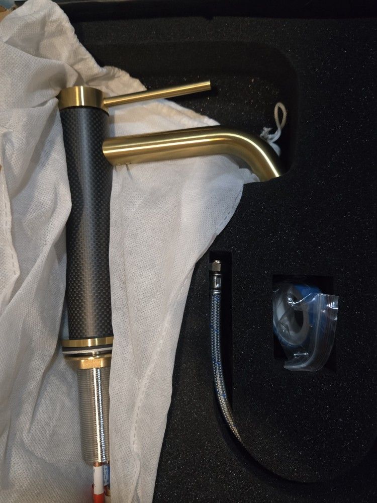 New open box! Never used! Purchased wrong size. 8" H SINGLE HANDLE Hole Faucet The VIGO Madison Sinale Hole Bathroom Faucet redefines luxury with its exquisite blend of modern design and advanced materials. Experience the CFiber bathroom faucet, where cutting-edge carbon fiber meets sleek Matte Brushed Gold/Matte Black finishes, creating a unique masterpiece for your bathroom sanctuary. This faucet features a streamlined single-handle lever for