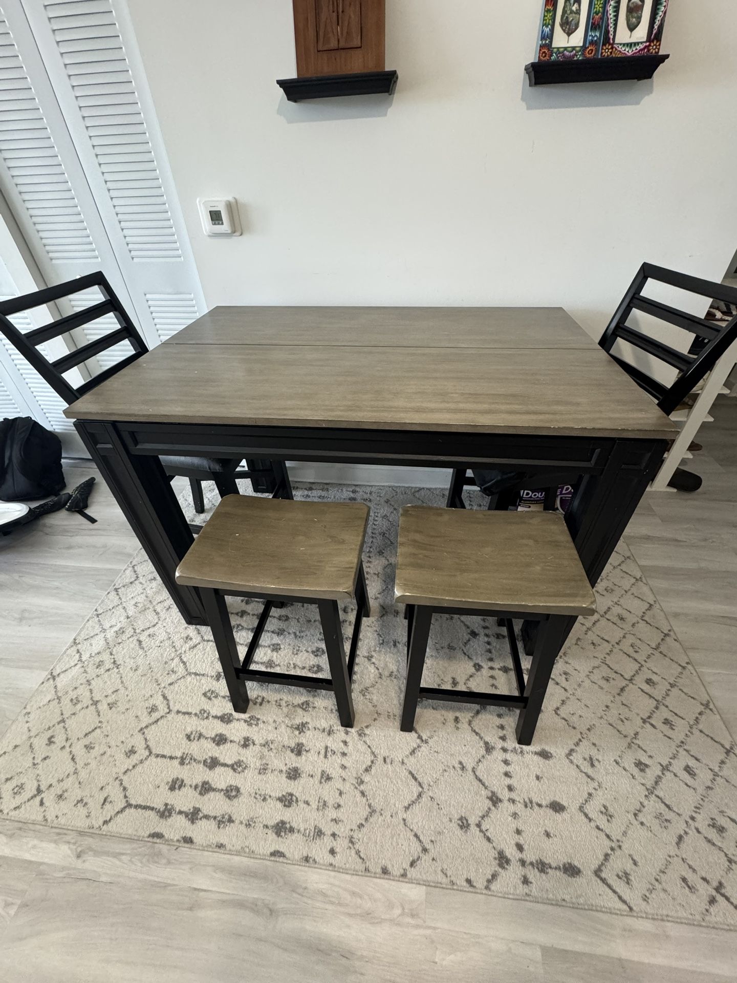 Dining table set with rug included. Includes: • Extendable dining table • 2 dining chairs • 2 bar stools • Area rug (approx. 60” × 88”) Table expands larger with built-in extension. Condition: Used. Table has some scratches and chairs show normal wear. One bar stool wobbles slightly but still usable. Rug included with the set. Great dining setup for apartment or small home. Pickup only.