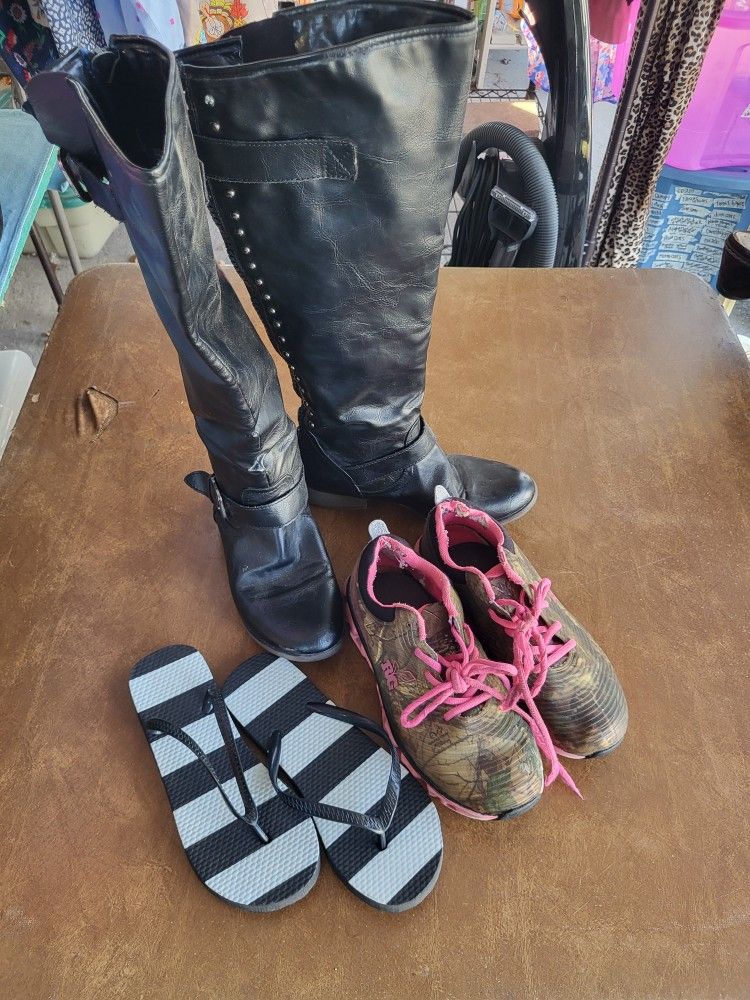 Women size 6.5 lot of 3 pairs. Forever tall black fashion boots, interior blue plaid, zipper in back. Rue flip flops new with tags black/white. camo tennis shoes with pink laces Pick up 5 miles west of Janesville Can meet westside or southside Janesville
