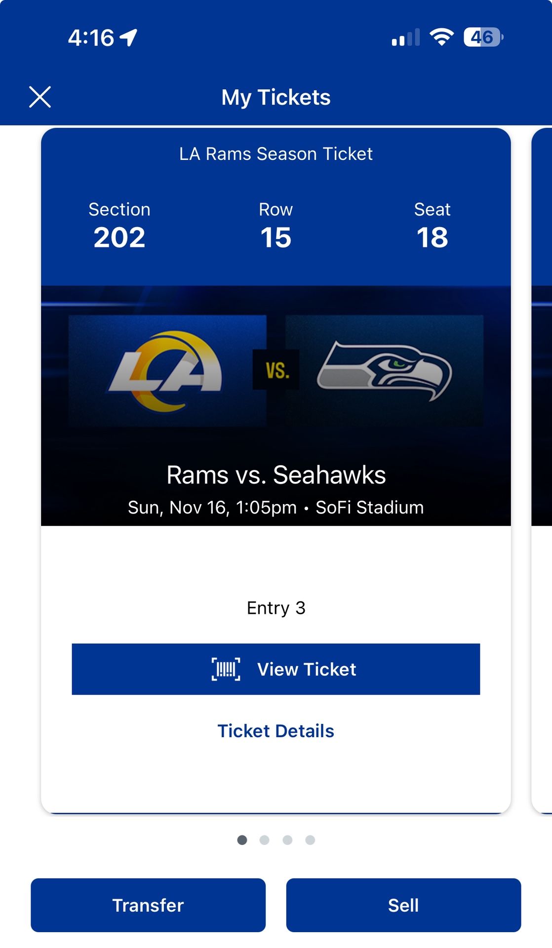 I am selling my 4 season tickets for this Sunday Rams vs Seahawks. It’s a huge divisional rivalry game against the top two teams in the west. You don’t want to miss it. Sec: 202 Row: 15 Seats: 18-21 Asking $285