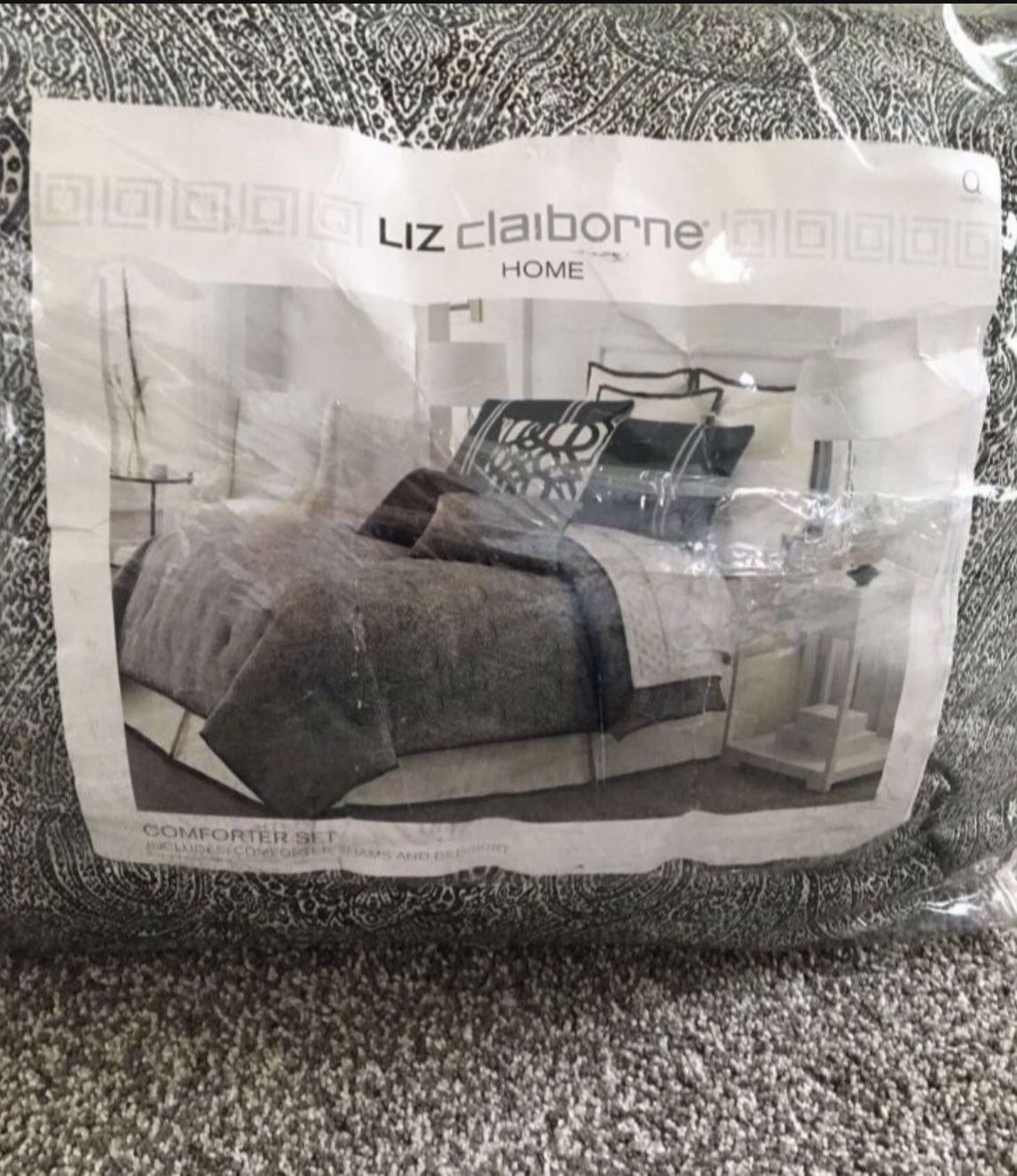 Queen size. Comforter set never used. Original price was over $300. Reversible to a solid black or a cream Paisley print. Black and cream colors. Measurements are on a picture I posted.