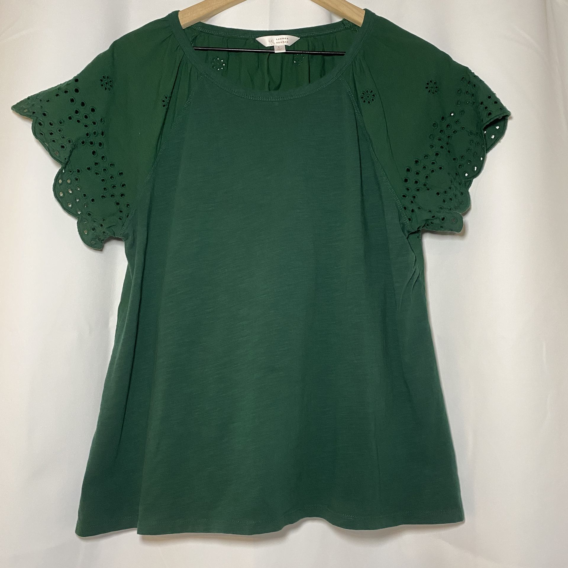 LC Lauren Conrad mixed material peasant blouse. Women’s size Large. Dark green color with embroidered floral cut-outs. Front of shirt is cotton and spandex blend with stretch. Back of shirt is 100% cotton and has the floral cut-outs all over. Round neck. Side slits. Machine wash and tumble dry. Excellent used condition. Measurements are approximate: Pit to Pit: 20”; Length: 24.5” From a non-smoking, no pet household. Located in North Phoenix off I-17 and Dove Valley.