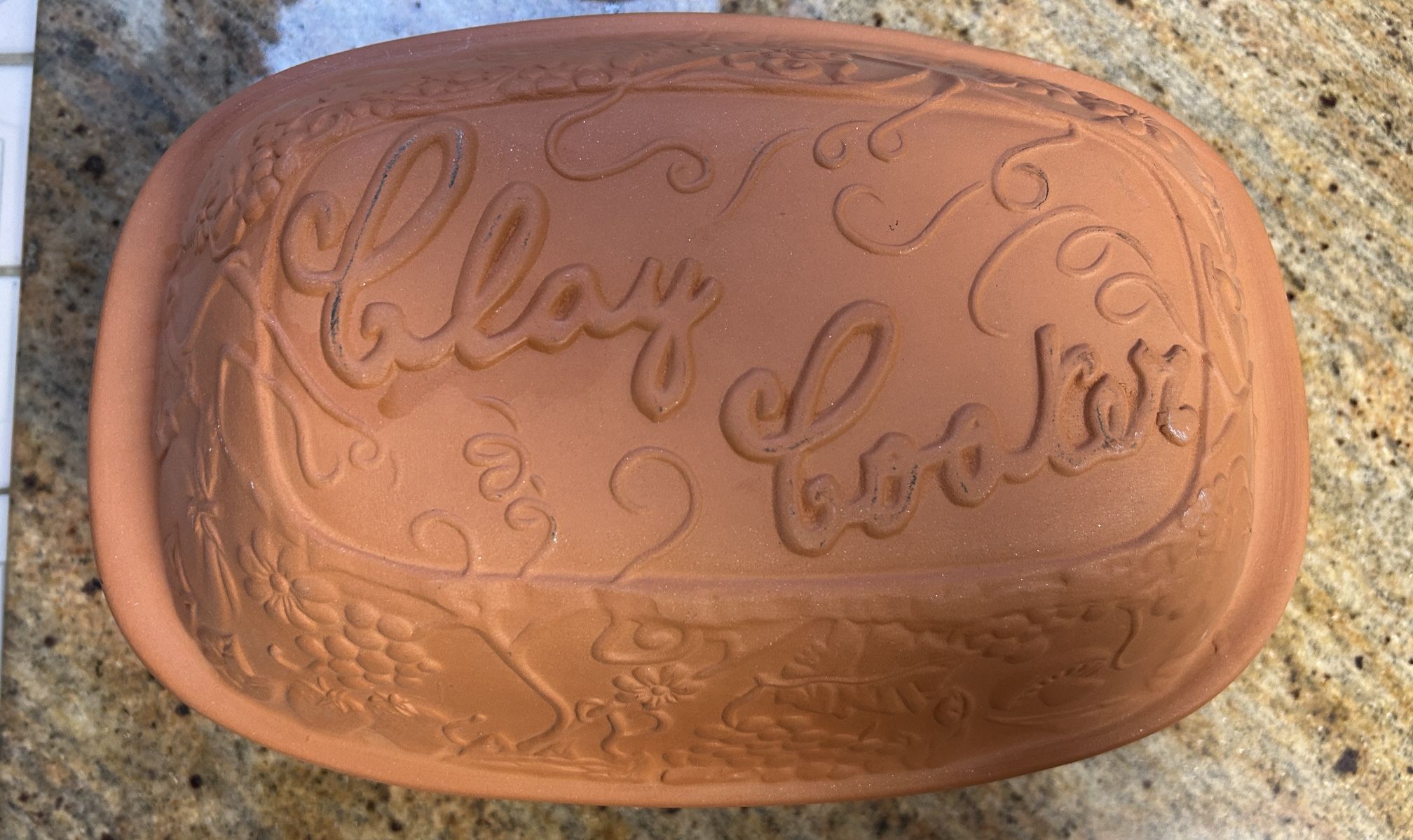 This is a Cordon Bleu terra cotta clay pot cooker with a grape pattern design. It is made from all-natural, unglazed clay material, which creates a steam effect during cooking when presoaked in water. Being unglazed, the inside of the unglazed lid has some minor discoloration that likely will wash off. The lip of the bottom piece has a tiny barely noticeable chip, but neither affect functionality. The pot is designed for healthy, non-stick cooking. It is oven and microwave safe, capable of withstanding temperatures up to 500 degrees Fahrenheit. The design features embossed grape and vine patterns around the sides and the text "Clay Cooker" on the lid. Excellent condition.