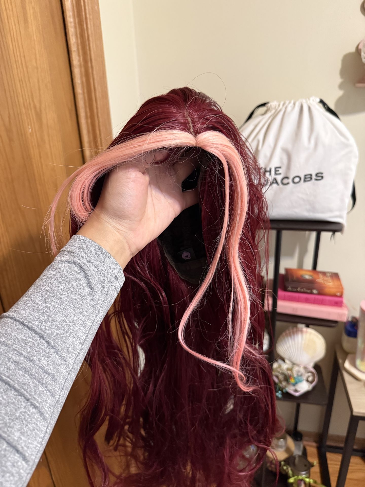 Pink bangs and Red long layered wig “28 inch Never worn