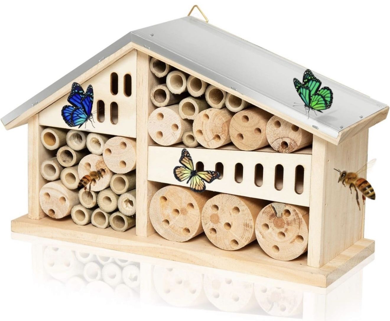New Size: 10.63 x 3.66 x 6.11 Inches Weight: 30 oz Quantity of Holes: About 80 Bee/Insect House Easy to Use Multiple usage methods. One way is hanging. A metal hook is installed on the back of the bee house, which can be easily fixed to the trunk, wall, net and the side of the garage/house. The other way is sitting. The bee house has a solid and thick base that can be easily placed on the ground or on a tree stump without down easily. Mason Bee Unlike carpenter bees, it cannot drill holes in wood. Females typically nest in narrow gaps and naturally occurring tubular cavities. Placing the bee house outside in the early spring months will attract Mason bees to build the nest, which will greatly increase the pollination rate in the orchard. Other Beneficial Insects The majority of coccinellid species are generally considered useful insects. They eat mealybugs, aphids and other destructive insect pests crucial in the production and success of crops. B8