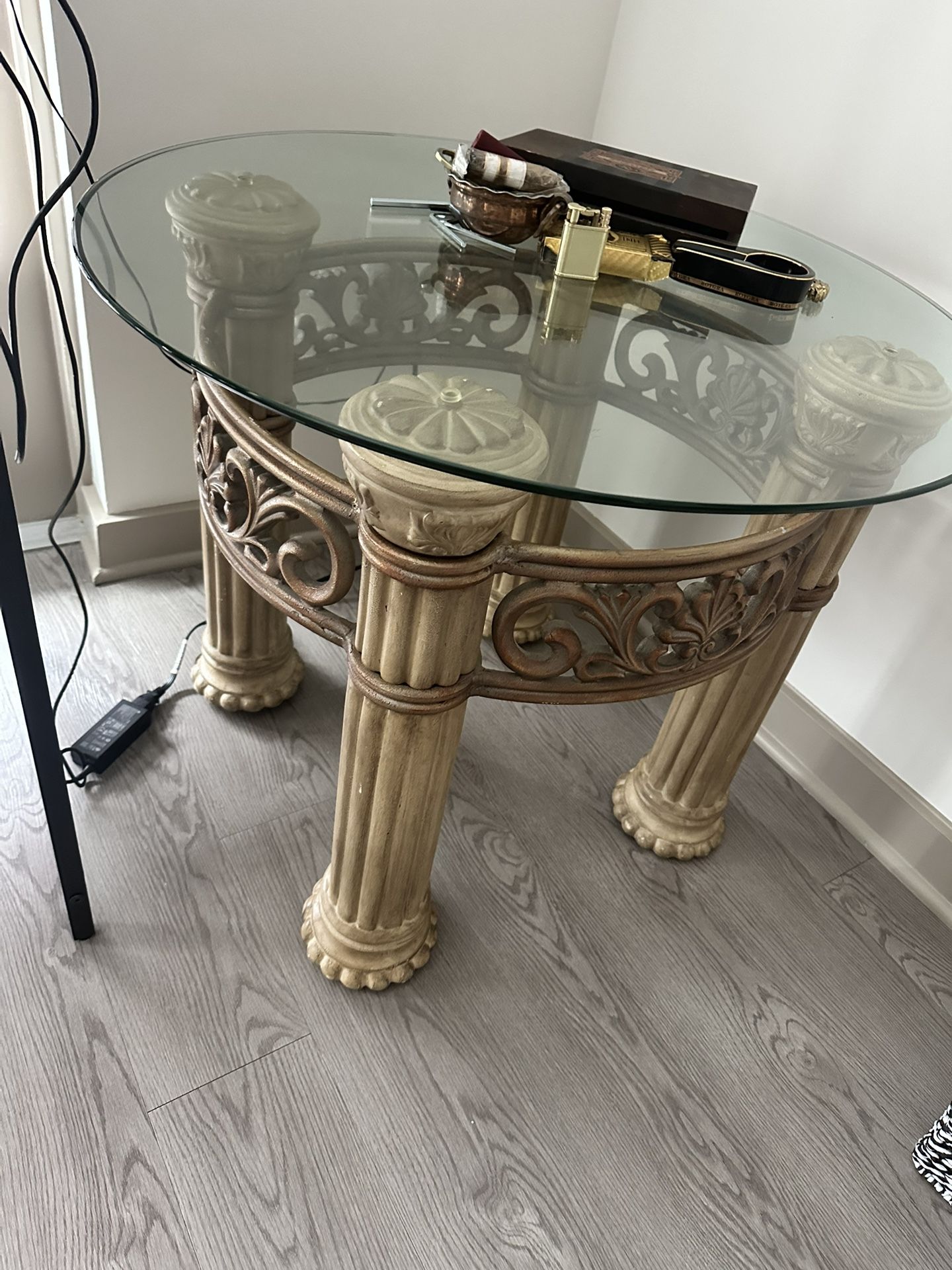 2 small round glass tables and one oval glass table. No cracks in glass, minor scuffs on table legs.
