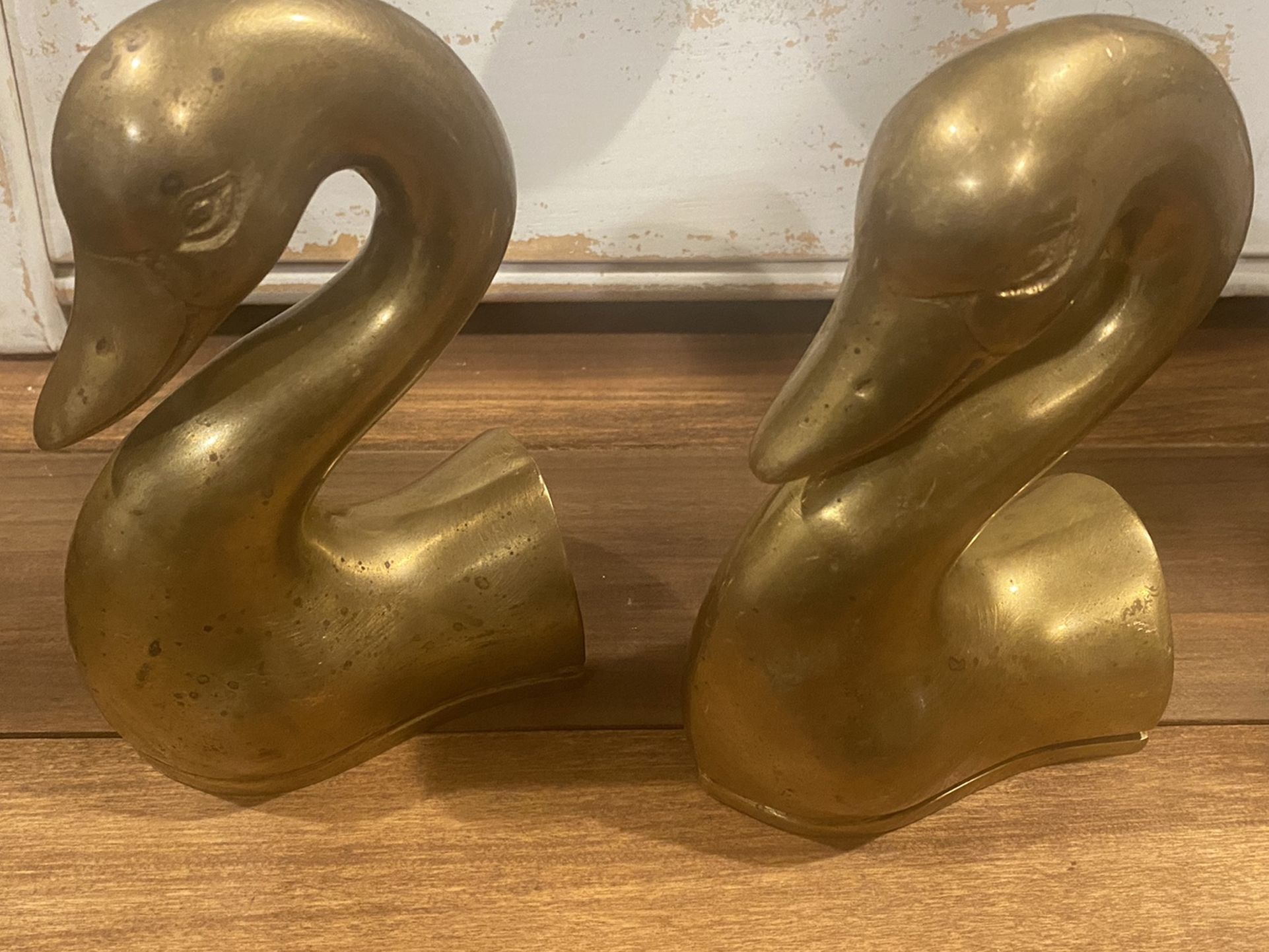 This sweet pair of swan head book ends are brass and weighted, plenty heavy to keep your books nicely in place. They have some minor wear due to age and one has a couple scrapes (see photos). A good polishing though and these would look even more beautiful! Great addition to your collection, or a fun Christmas gift for the person on your list who loves vintage finds. Pick up in north Canyon Lake, cash only.