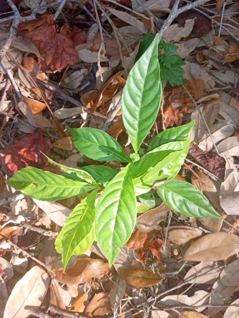 Florida wild coffee bean plant. Coffee cherries are edible and very good, comparable to a small sized blueberry, blooms twice a year.