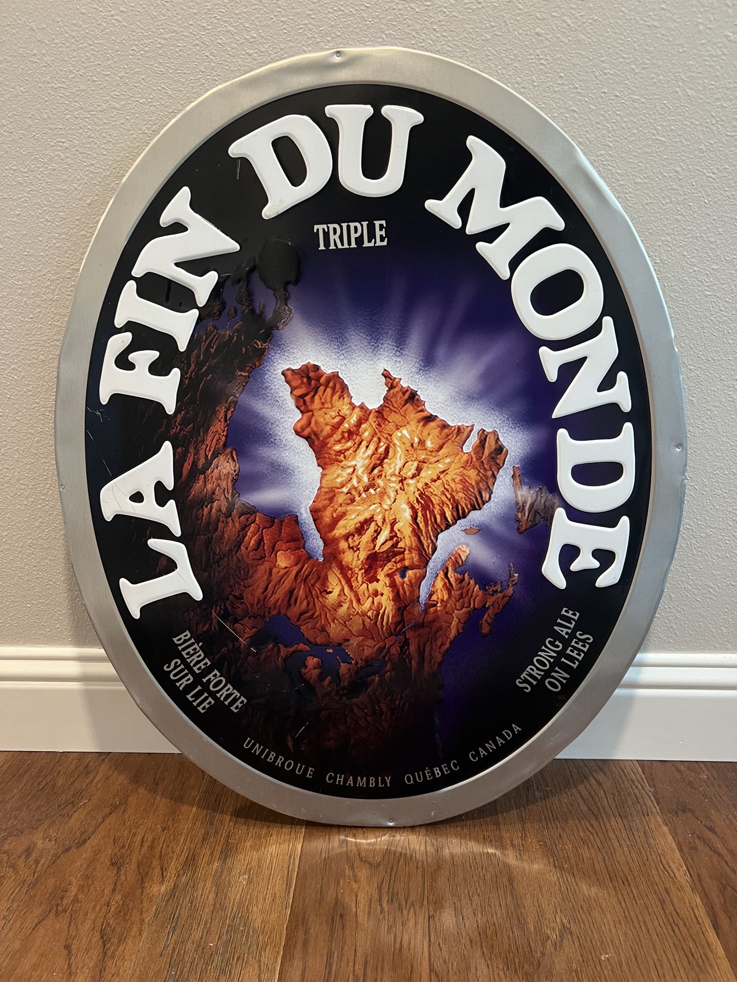 Are you starting to feel like the end is near? Everything is on fire but you’re just one person trying your best to make it through the day? Do you want to travel to the farthest corners of the earth to get away? So many interpretations! Celebrate it all with this cool Canadian beer sign!! “La Fin du Monde” - THE END OF THE WORLD 30” x 24” Unibroue Chambly Quebec Canada lightweight, metal Beer memorabilia, signage, wall art, decor, cave, brewery