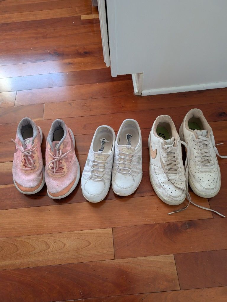 Nike and sketchers cheer shoes $8 each . No rips ,would probably use some gentle cleaning.