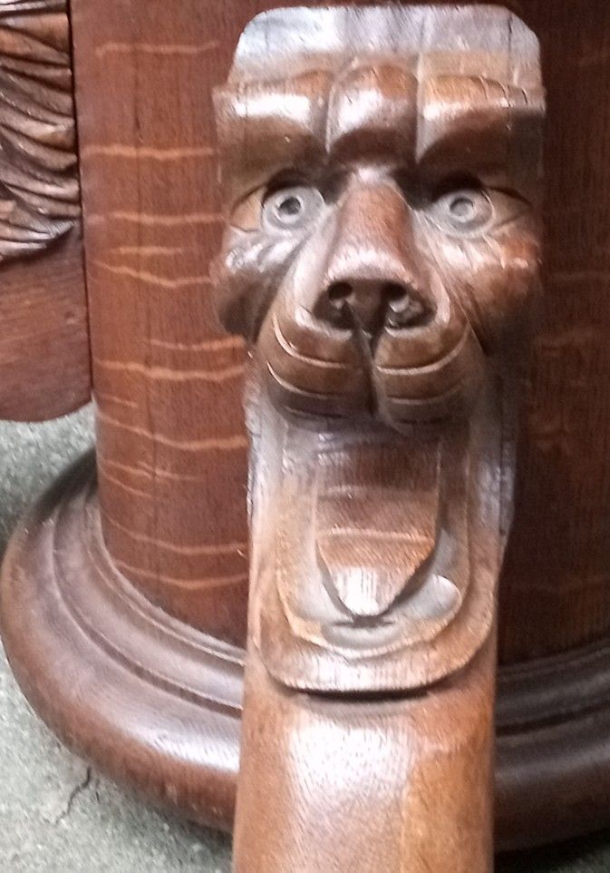 Rare Lion Head Face Antique Oak Pedestal Dining Table