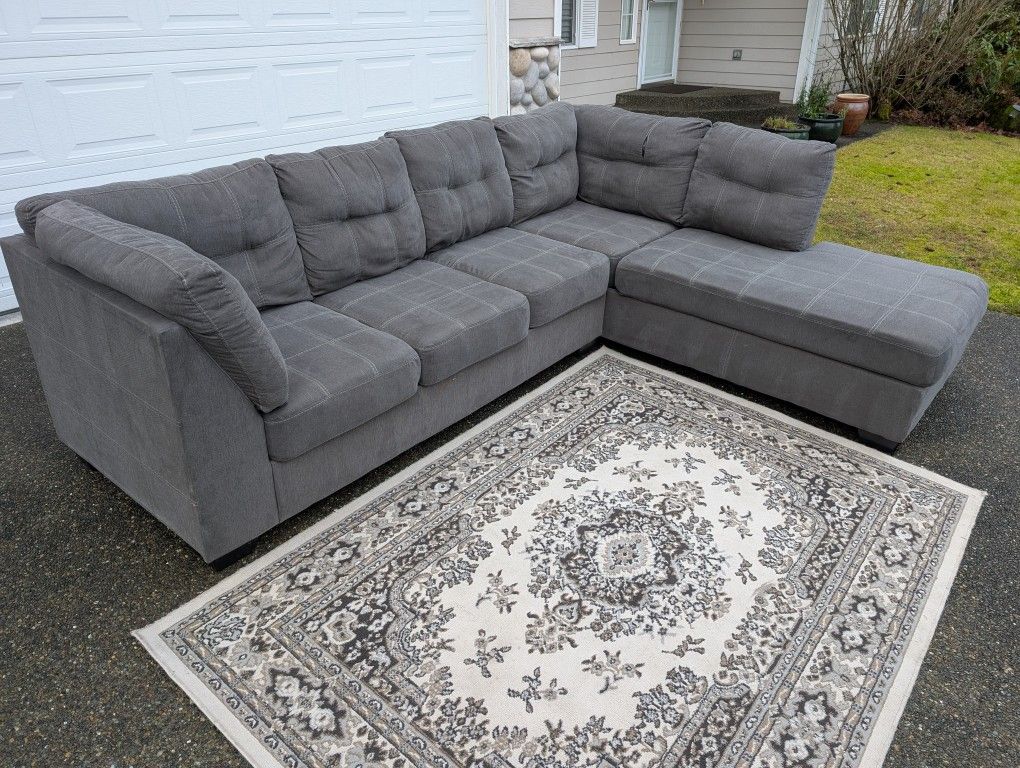 Grey sectional sofa. Ashley furniture. Kid and pet friendly. Sofa received a nice vacuum. Measures 114 in by 86 in . Delivery available within 25 miles of Graham Washington 98338